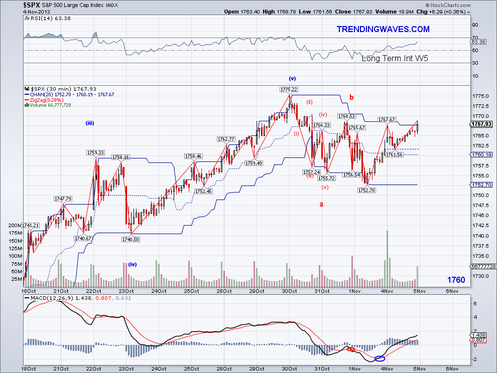 Looking at the longer term chart, the original targets I had earlier in the year have been technically satisfied (those target price labels have been there for months) so whether or not the 5th wave is over or we're just seeing the beginning of it, odds are a multi-month correction is coming according this count. With that said, if I break down the "stand alone W3" and pick what I see as W1 then the projection is 1810-15 and if I add W1 points (66) to the low yesterday we get 1812. So I am paying extra attention to the coming bearish wave and the 1752-55 level.