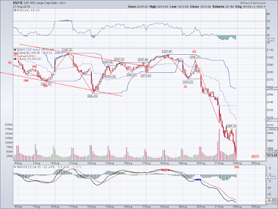 This is a classic example of key support breaking and all hell breaking loose. The market had been supported by that key pivot all year long until it finally broke last week. And despite all the panic and hysteria, there was ample warning something was not right with the death cross in the DJIA and lower lows being put in weeks ago. This correction is lining up well with the LT W4 count and today's lows reached the target area I mentioned last week of 1820-1900. Looking at the short term count and support levels, I can see one more leg down to challenge 1820 since 1905 broke. I'll probably pick up some shares if 1820 gets tested to play the bounce. With that said, if you are planning to go long, watch those support levels and place your stops accordingly. Panic/Manic markets do not care about oscillators.