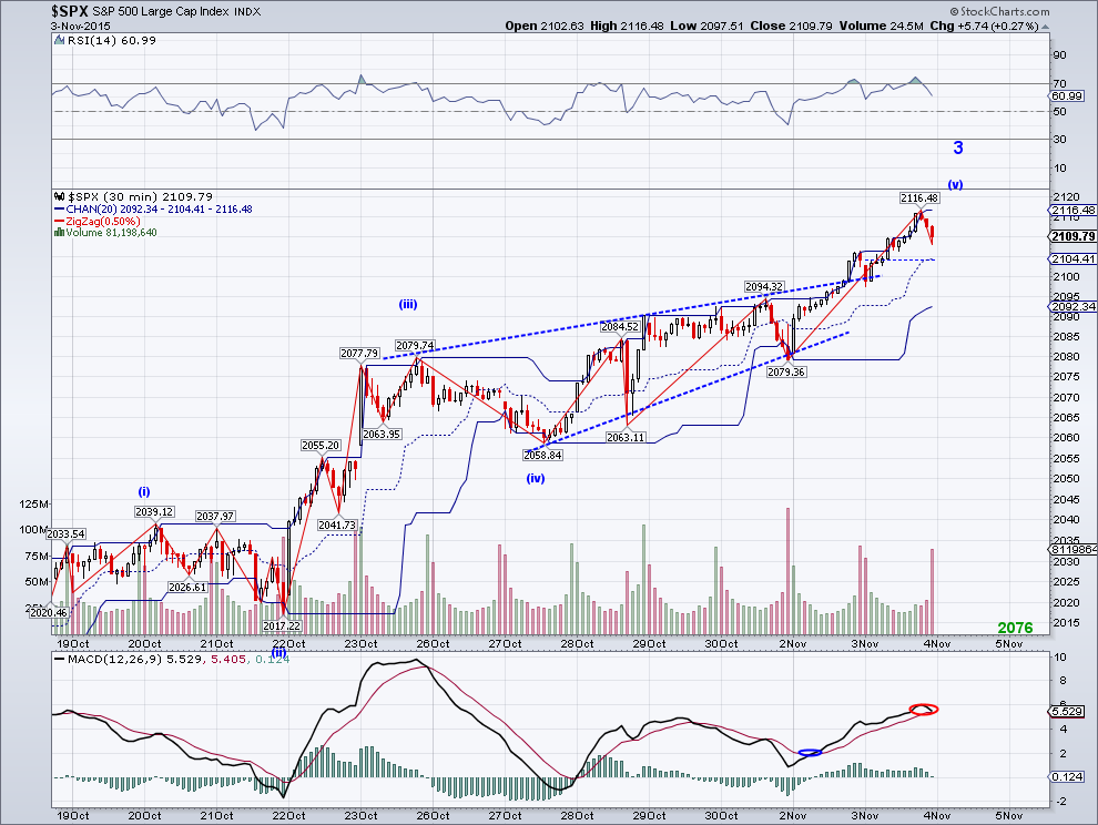 The market had a strong day as expected and now it is getting closer to the resistance level I mentioned yesterday. If this wave is sub-dividing (it looks likely), we should see a gap up or continuation of the rally early tomorrow morning. Perhaps news of the budget deal will give bulls enough of an excuse to push against 2103.