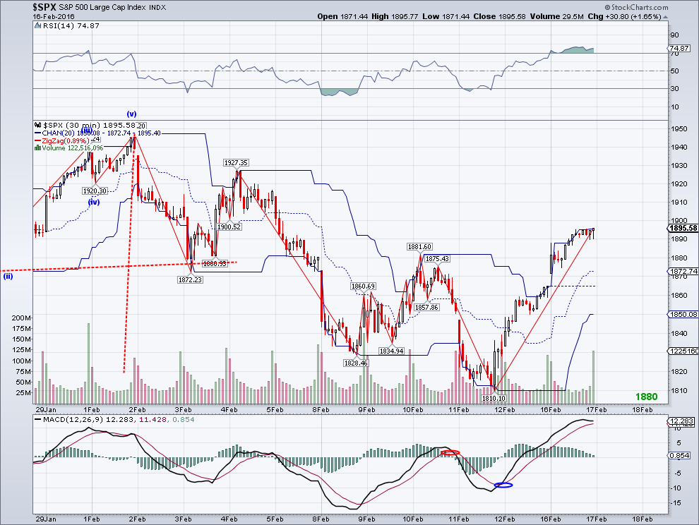 As stated last week prior to the sell off "The less bearish wave pattern would have this wave bottom in the 1812-1820 area". Today's break of 1881 resistance confirms the bottom at 1810 and we could see sustained upside to the 50 DMA currently at 1963. While it is too soon to call for a change of the long term trend, the bottom at 1810 lines up almost perfectly with my prediction of the LT W4 bottoming at 1820. Stable oil prices and a shift in sentiment in markets around the world will help the market move towards the 2000 level again.
