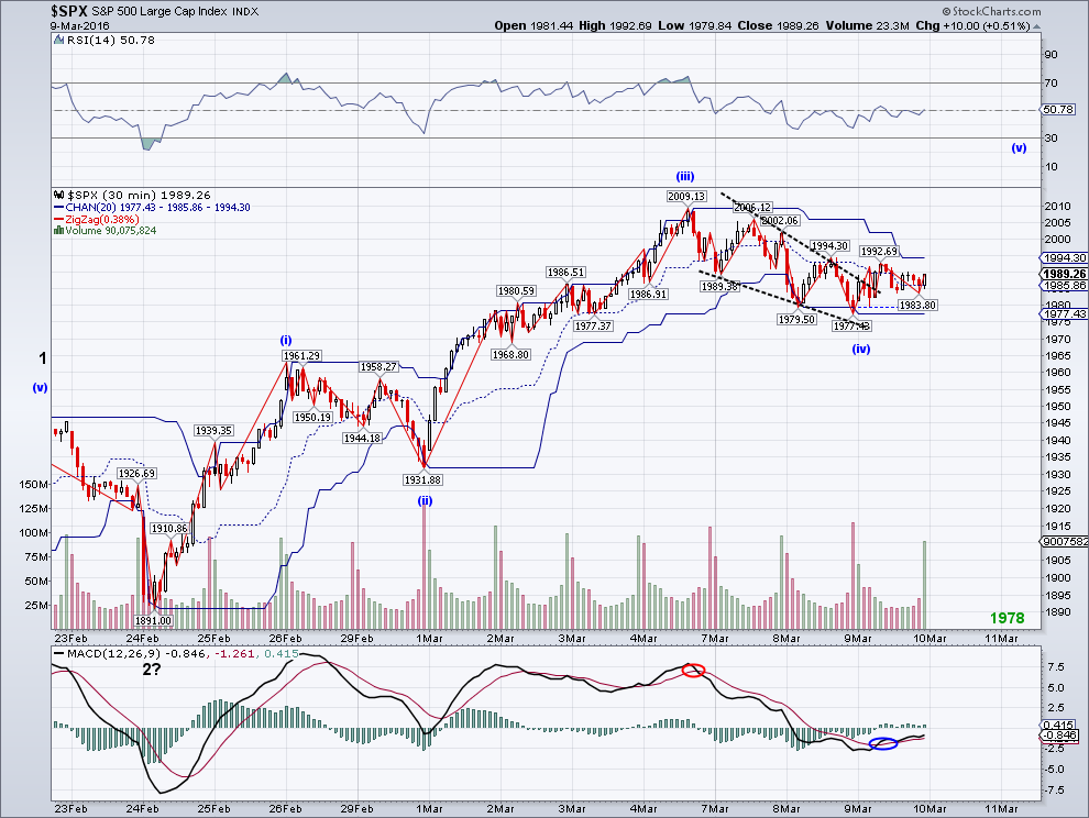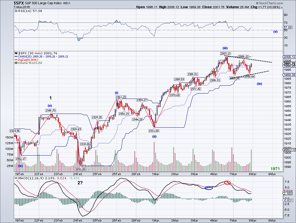 As stated couple of weeks ago "Support and the TA were tested as expected and the strong reversal signals the beginning of another impulse towards the 2000 level". Today the 2000 level was finally reached and the bullish leg that started at 1810 is now 200 points long. Considering oil continues its climb towards the $40 level, equities could keep climbing despite rallying 11% from its February lows. Whether the index is able to re-capture and trade above the 200 DMA is the million dollar question. Personally, I lean towards this rally being the beginning of a LT W5 on the long term count posted a few weeks ago. Pessimism reached very high levels last month despite the economy being in a good shape, so fundamentally speaking this would be an ideal time for another multi-month rally to new all time highs to complete the count that started in March 2009. Perhaps history will repeat itself (like it happened with Bush in 2001) and we will see a major correction along with a recession in the first year of the next President.