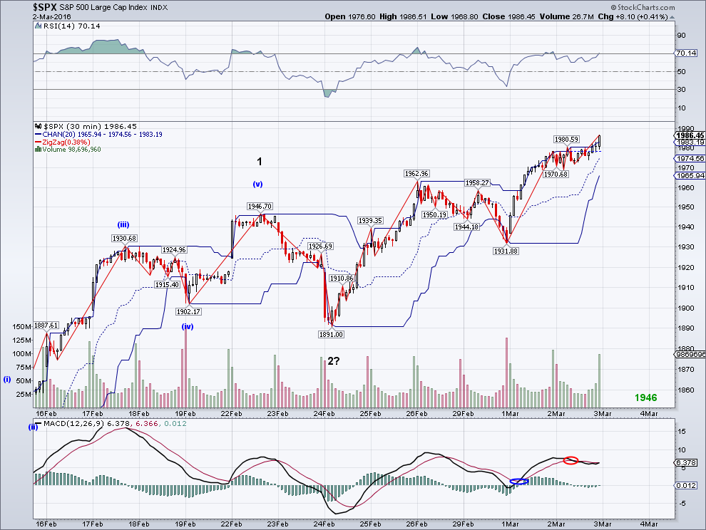 The market looks like it is finalizing a short term correction and we should see another bullish leg to complete the 5 wave count as soon as tomorrow. Oil rallied back to the $38 level today and we should see some of that bullishness help equities in the next couple of days.