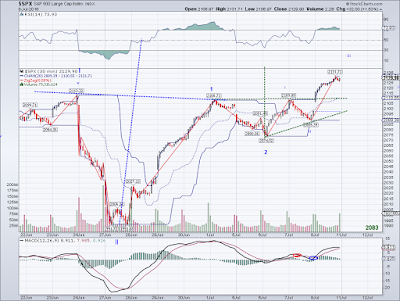 The rally continued today without much of a retrace in what seems like a micro-w3. I assume a pullback to gap support will come in the next session or two so I can buy back my long position. The rally is being fueled by short covering and people buying the break out so this rally might go on for a while without a substantial correction, possibly to 2200+.