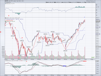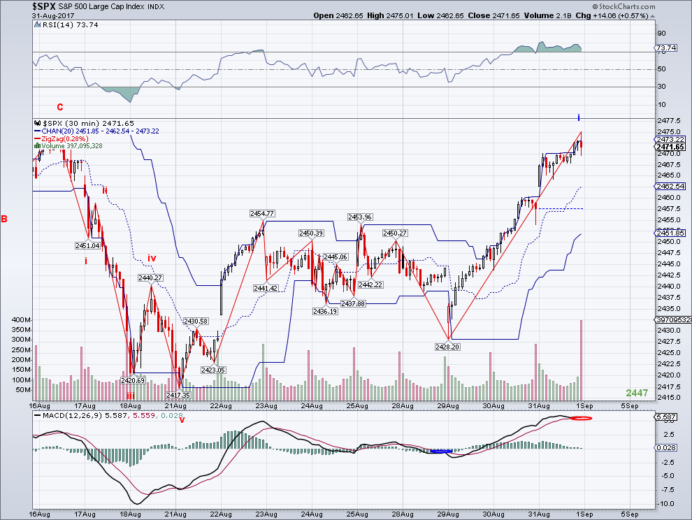 The market closed at an all-time high and continued upside should be expected given the current count. The hurricane not being as catastrophic ended up being the excuse to rally and I assume we should see 2500+ sometime this week. If the labels on the count are correct, the target for the 5 count is 2560 before another significant correction. But as I have been saying since the market reached 2400, the bull market is getting closer to the end and a substantial decline is coming this or next year when the full count completes. So, it's a good time to trade keeping in mind a major turn could hit soon.
