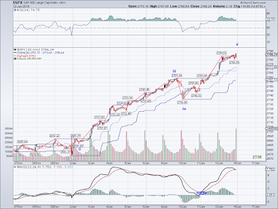 The market reached the 2800 level as expected and I am now tempted to label the IV wave to a II. If prices keep going up with strong momentum, it means the rally has ways to go before a true correction takes place. Too bad prices never retraced enough for me to add longs but it's all good, my China shares are going up a lot too so can't complain. I am 4% away from my retirement goal on my long only portfolio, this despite the fact prices in the Chinese index are nowhere near the high of 2015.