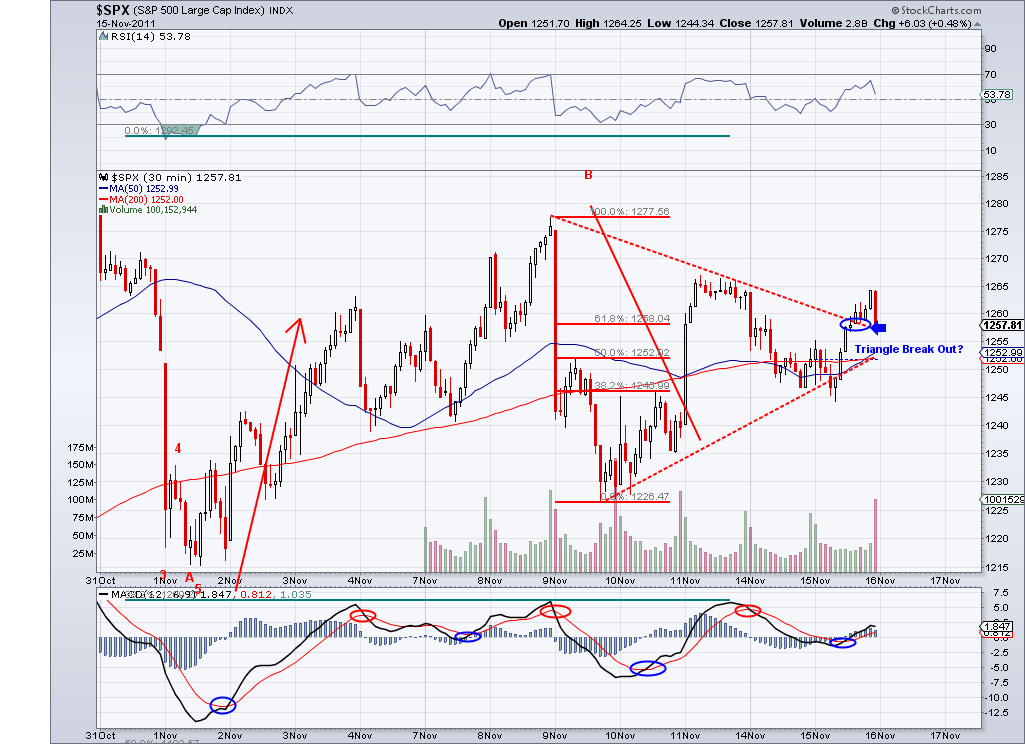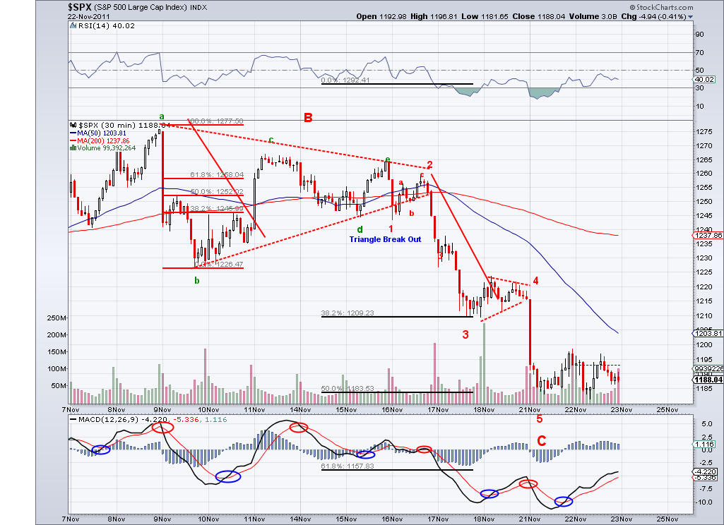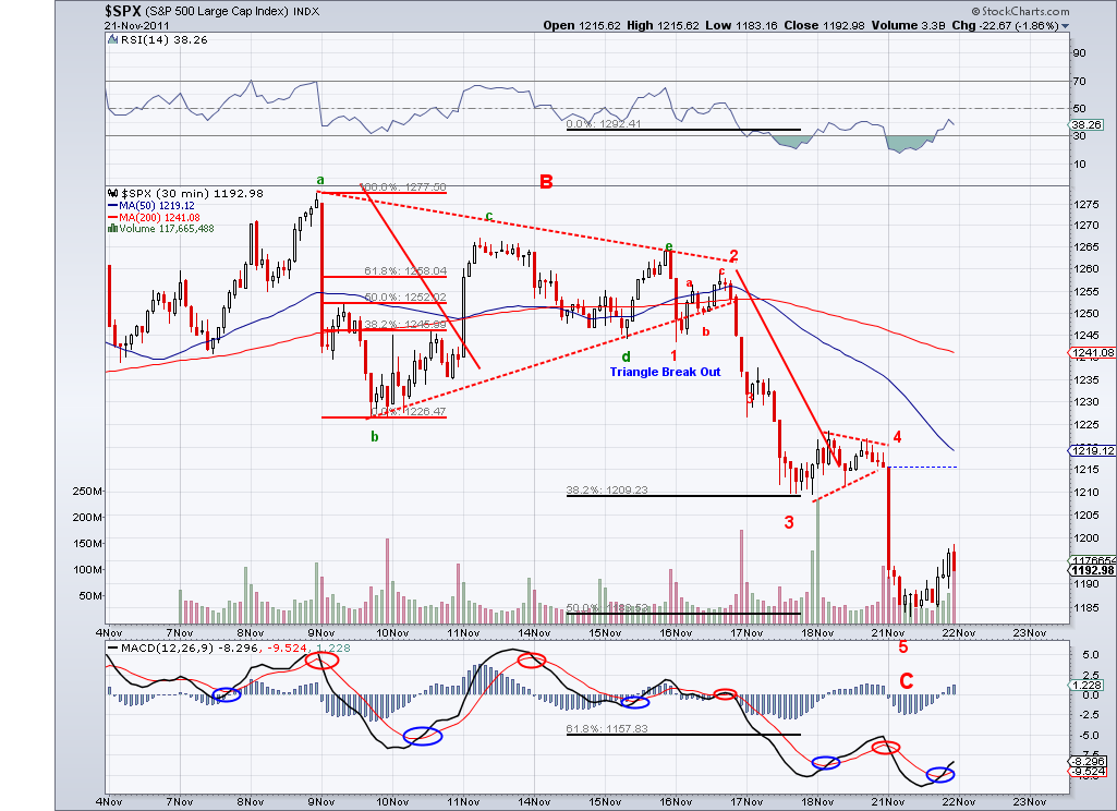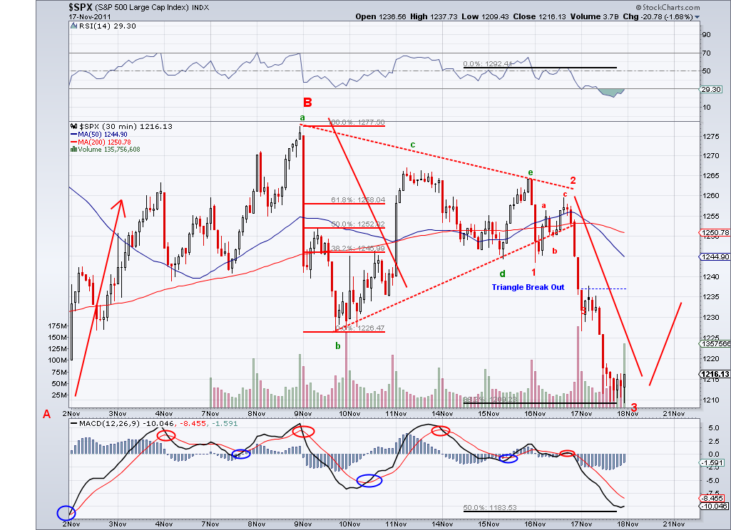The market is finally revealing its intentions and confirming we are on our way down. There are different ways to take a look at the triangle but I see the pattern completed and a gap down tomorrow or continued selling would confirm a bearish 3rd wave (which I had been expecting since Monday). So I am inclined to think the market is setting its sights on the 50 Day MA which is at 1205 as of today, that would be a logical spot for a bounce. However, in an ideal world we would get a correction until Thanksgiving and then see a beginning of the year end rally. So we'll have see how the week ends. I am still in cash and being patient.