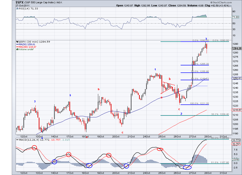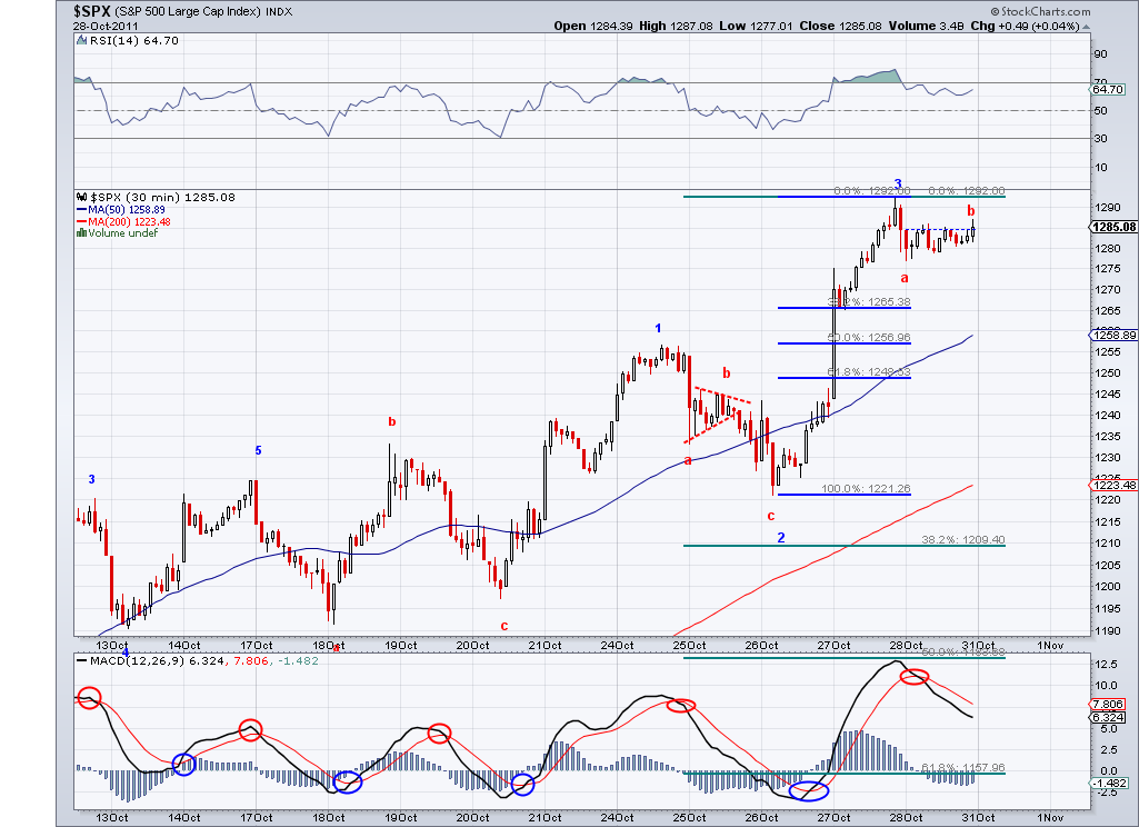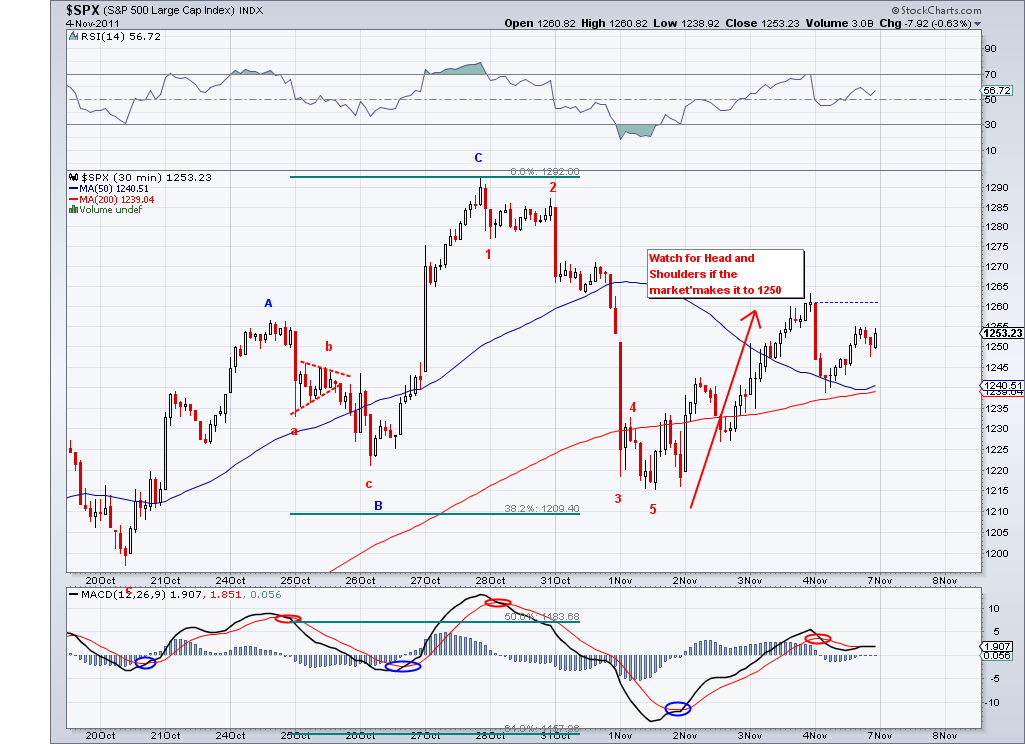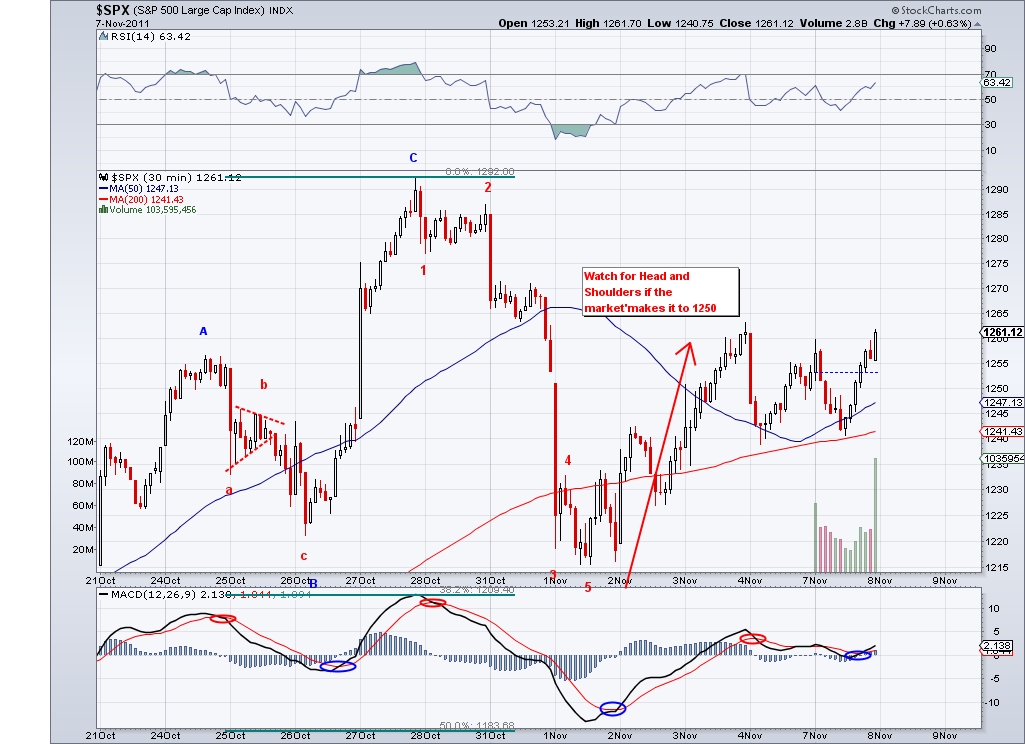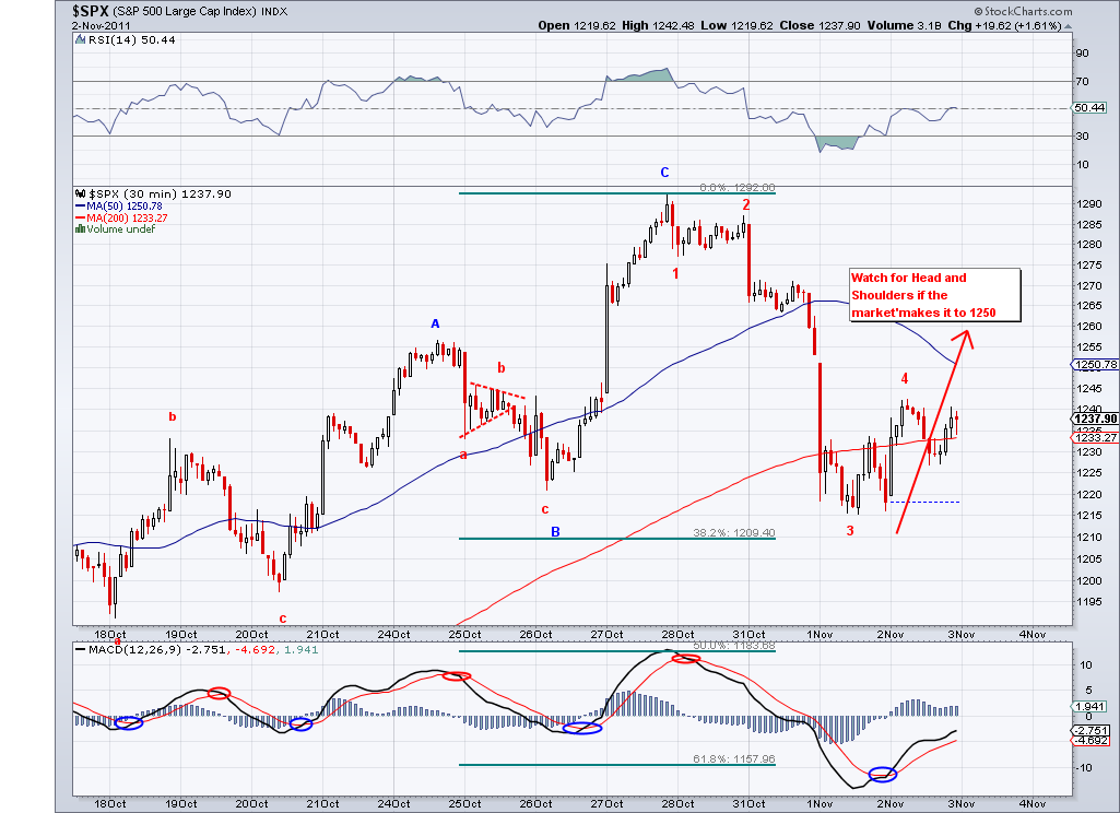 The market continued to climb today but not in a impulsive way, so I continue to believe this wave from 1217 is corrective wave and will end relatively soon. The next bearish wave should be a stronger wave that would take us take us to the lower 1200's. The market needs a catalyst for that and maybe the current confusion in Italy and Greece will help the bearish case. The markets started the rally supposedly because of the perceived solution to the European problem but 200 points later I don't see anything solidified, so the same issues that cause the sell off in the first place are still present.