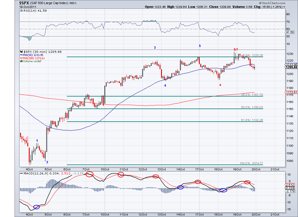 The correction continues and I am inclined to think there will be one more leg down until the correction ends. Whatever the market decides to do, so far all these waves from 1267 look like corrective waves so we should see a chance of mood to the positive side sooner rather than later. In a way, this type of market is great for swing traders as the European issue will be used over and over for sell offs and for rallies. It really depends on the current social mood. Hope we'll get more clarity tomorrow or Monday.