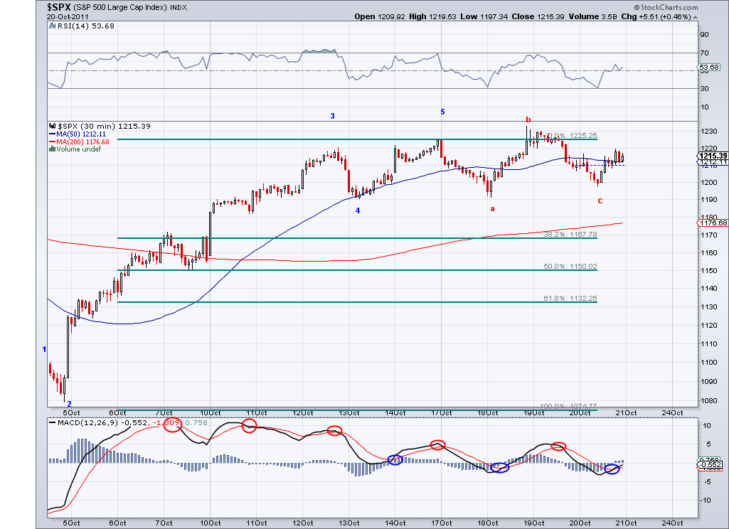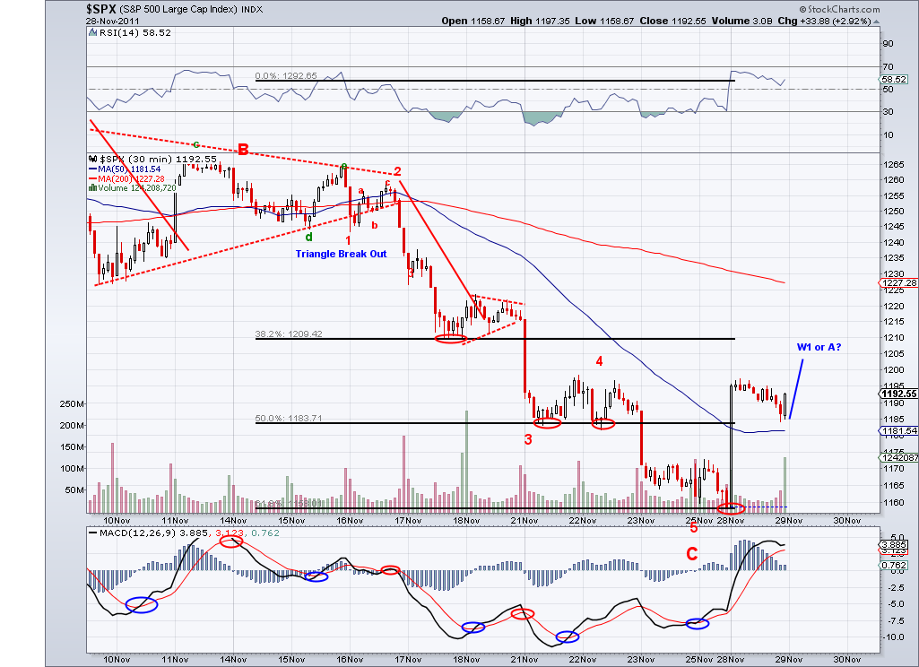 The market ended up putting a 5th leg down and tested the 1180 level as I first started speculating 3 weeks ago we would. And now I see a complete or near complete ABC move from the 1292 high. So I think the market has reached the necessary Fib retracement in this correction and now there is enough room for a big rally that will take us well above 1300. I've missed maybe a couple of moves since the summer so I might be wrong about this coming rally but so far I've been very accurate on the majority of waves. I am already long as of late last week and will be adding margin long on trade above the 50 day MA at 1207 and using this average as a stop. The whole European problem and the budget issues will be again forgotten only to be remembered again by the time we need a correction.. when I first predicted 1180 and the test of the 50 day ma 3 weeks ago everything seemed dandy which made my target seem far fetched. But I said it then, the European issue is going to be used as an excuse to buy or sell and the losers are going to be the overly excited crowd (those that sell in panic or buy in euphoria). We'll see if there is a 5th of a 5th in this current bearish wave but I am betting on a big rally coming at any time.