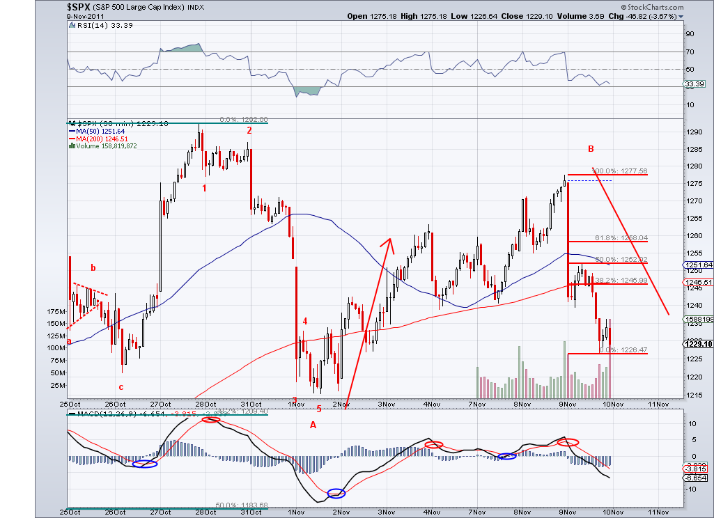 I guess the signal on Friday was legitimate in that the trend starting turning up again. And from looking at the wave structure it seems like the market is working on a B wave after the A wave from 1292 to 1217, so this B wave could go as high as 1292 or a bit more (in case of an expanded flat). Once the B wave completes, we should see another big bearish leg to finish up the C leg and then perhaps launch into a big bullish wave just in time for the Santa Rally. I am in cash in my trading accounts and will look to short at the next bearish TA confirmation and then go very long for the end of the year rally.