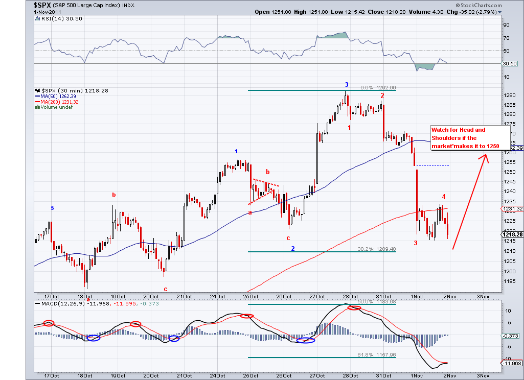 The market sold off hard as I expected (when 1255 was broken) and now it seems like it has another wave down to test 1200 before rebounding to the 1250? area (Watch for Head & Shoulders if that happens). But again, the fact the market has sold off 70 points after 220 point run is essentially expected and not much of a surprise. All the market needed was an excuse. The real question going forward is whether the market is going to continue the bear market or bounce back above the 200 day MA. So far we have 4 waves down and once the 5th is complete we can start speculating on whether this is an A of a correction or a W1 of a continuing sell off. I lean bearish as long as we trade under the 200 day MA. I did not hedge today as I rather wait for the bounce and do this at the TA.. too bad the sell off started yesterday in the last few minutes. I assumed 1255 was holding since I checked 15 min before closing.. oh well, it was Halloween and that was actually more important.