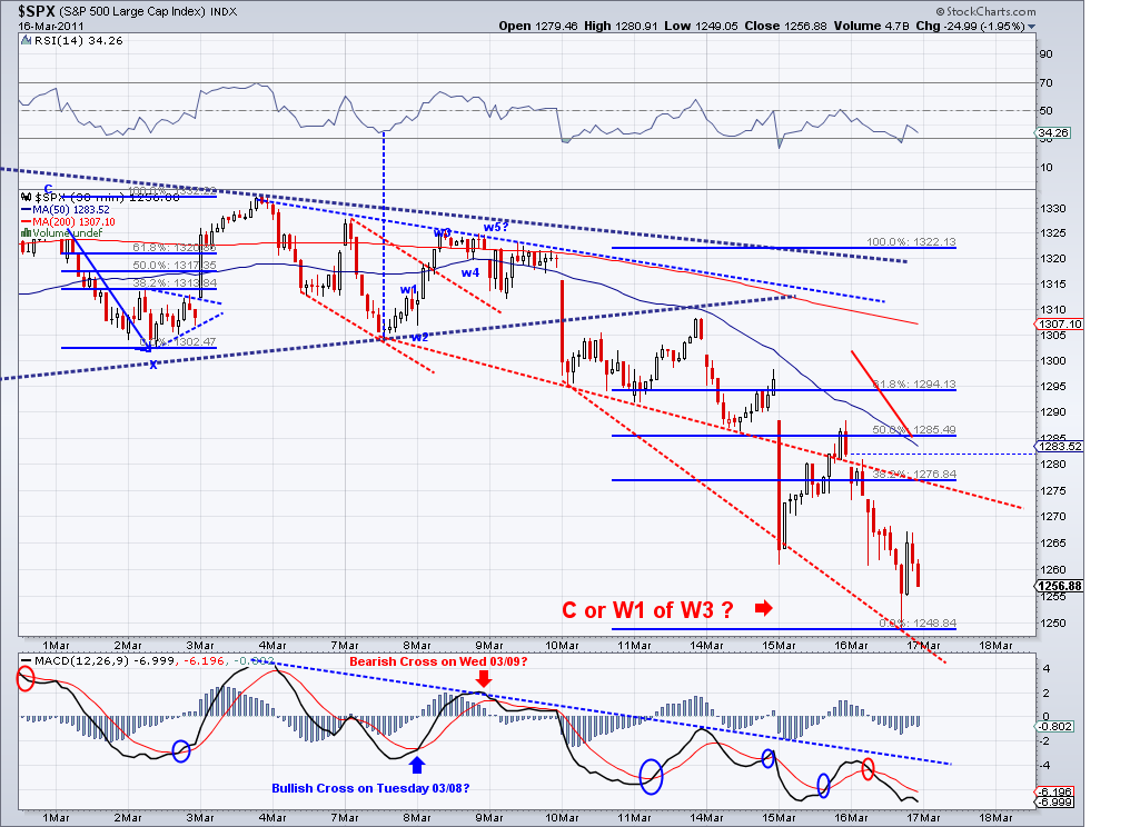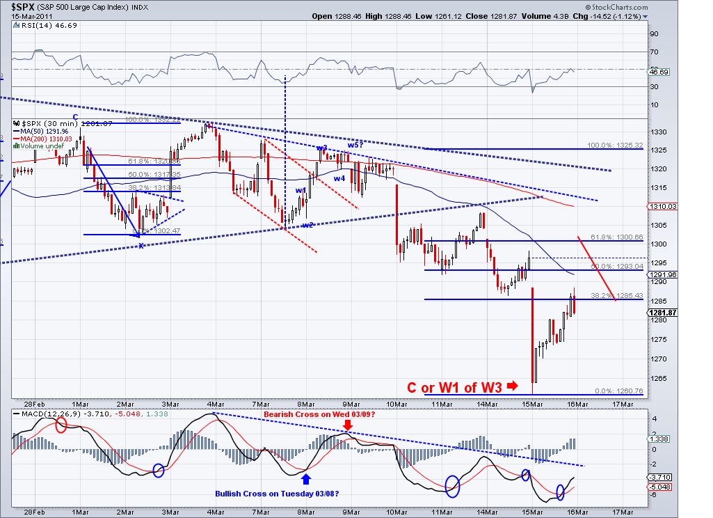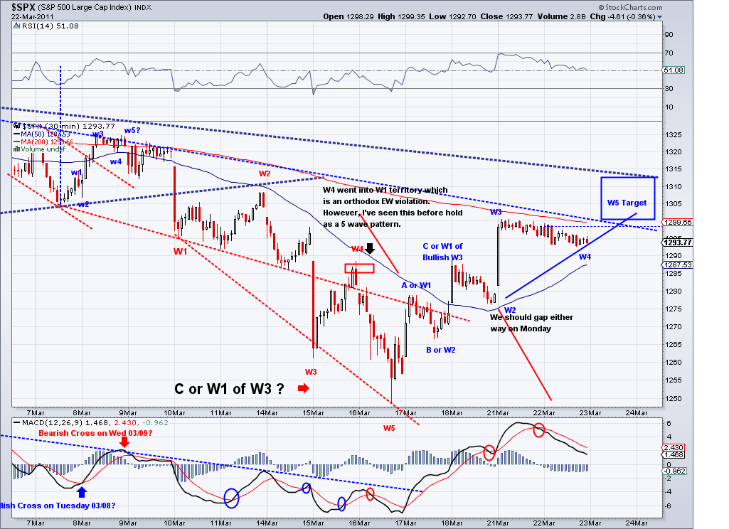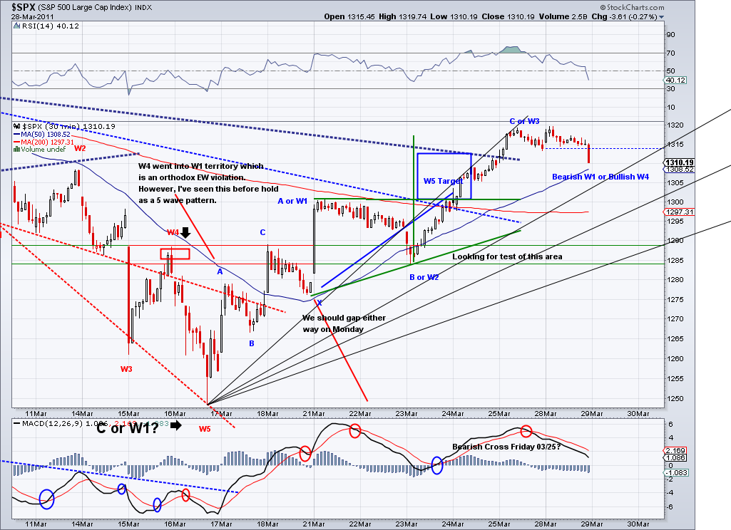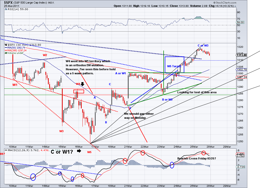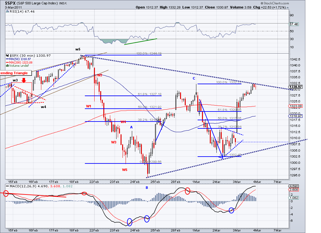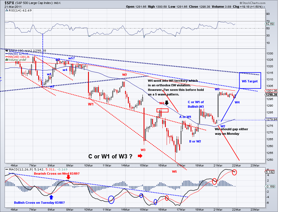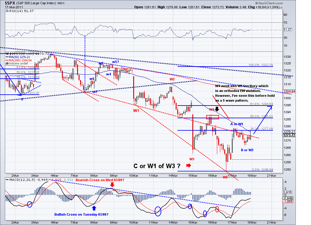 1315 target I posted yesterday has been technically met during after hours trading. I speculated on an Ascending Triangle pattern that completed in the e-minis and we woke up to the trust out of this triangle. And now that the area I had marked as a target has been met and the market is challenging the bearish trendline, I think we could call this enough for a counter rally. Now, what comes next will be the make or break wave for bulls and bears alike. I think we will retrace to test the TA which is currently at 1287 if the bearish wave starts tomorrow. If we get there in a sell off and the 1282 support is broken, then I think there is a good chance we'll see 1220 fairly soon. However, if we get there in corrective waves (zig zag waves), chances are the bottom is in for this correction and we will go on to new highs for the year. I favor the bearish case based on the trendline and the bad fundamentals but I will trade according where the trend takes me. As of today, the TA turned positive and if not reversed soon then the short term will officially turn bullish.