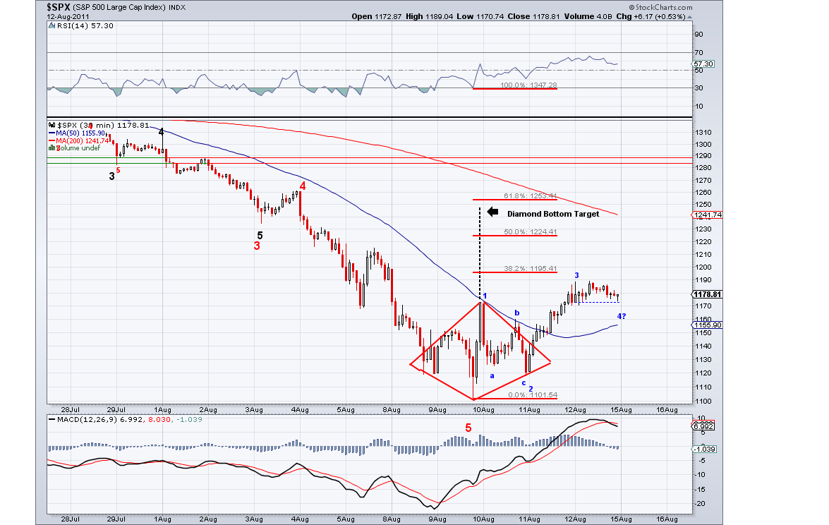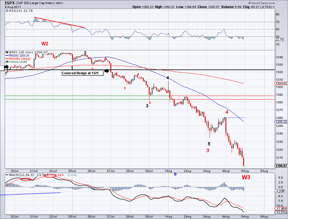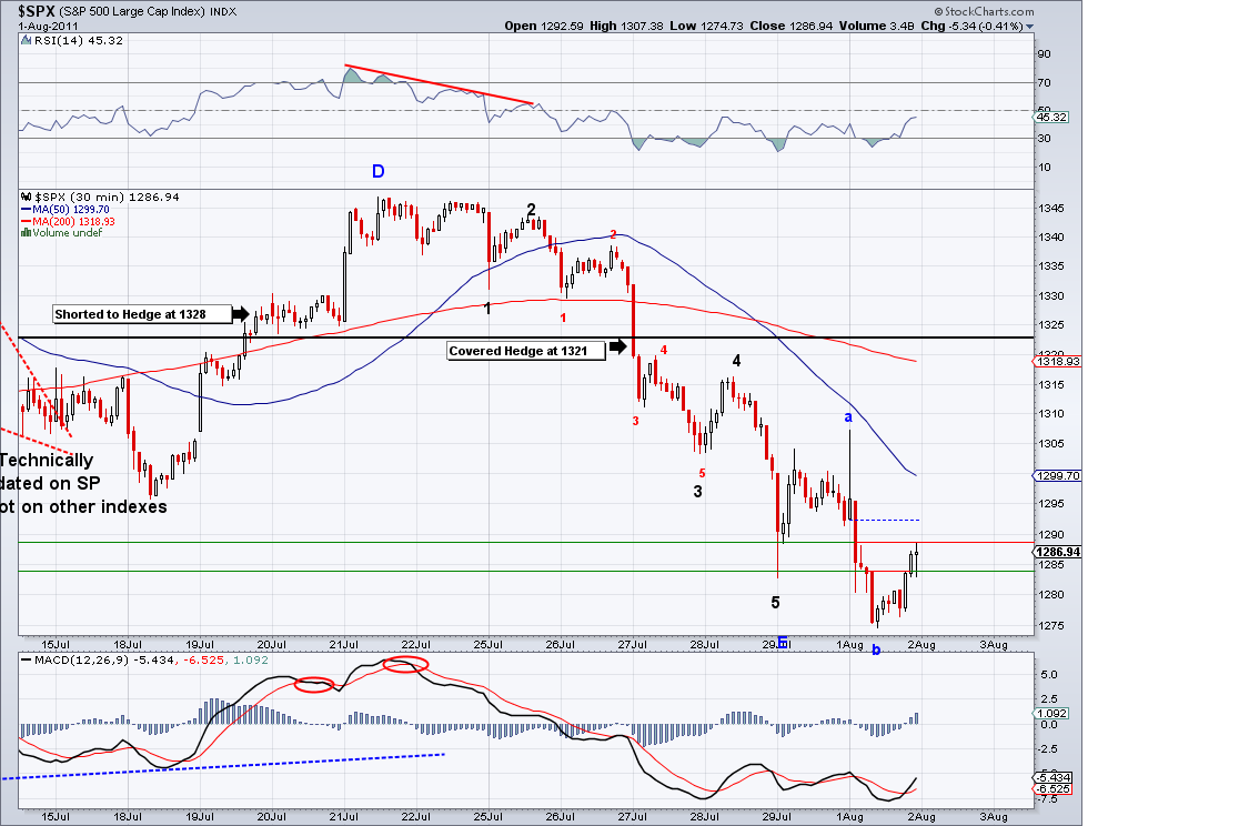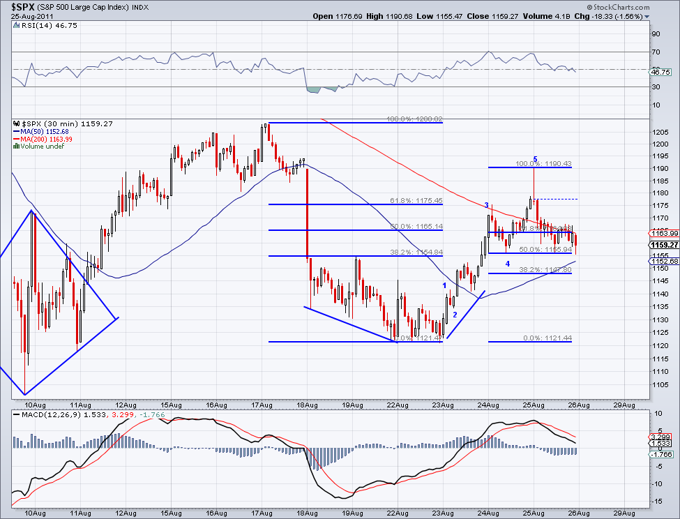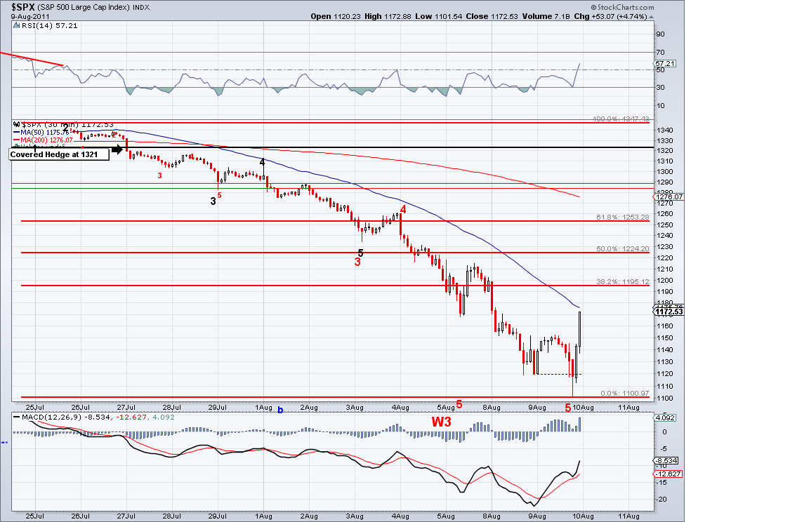 The market finally tested the TA today but failed to close above it. The last time the market traded above the TA was at 1328 or 142 points ago and the TA might turn positive next week so it remains to be seen how the rest of the current wave plays out and how it gets corrected. I was originally inclined to label the waves an ABC move after the 1101 low but in looking at the structure it seems to me like 5 waves so this could be an A or a W1. I think we should be able to tell on the coming bearish waves and if divergences develop. I am ready to jump in again should the market start trading above the TA and as a matter of fact I did today but I got stopped out at break even again. I've lost count how many break even trades I've had this week, must have been at least half a dozen.