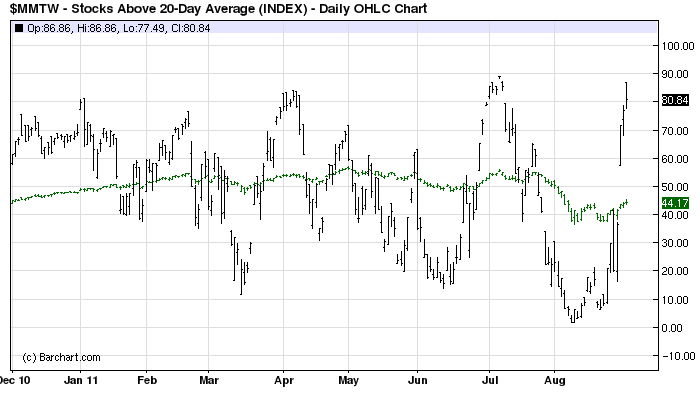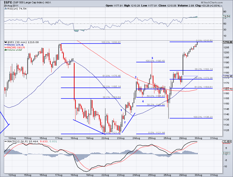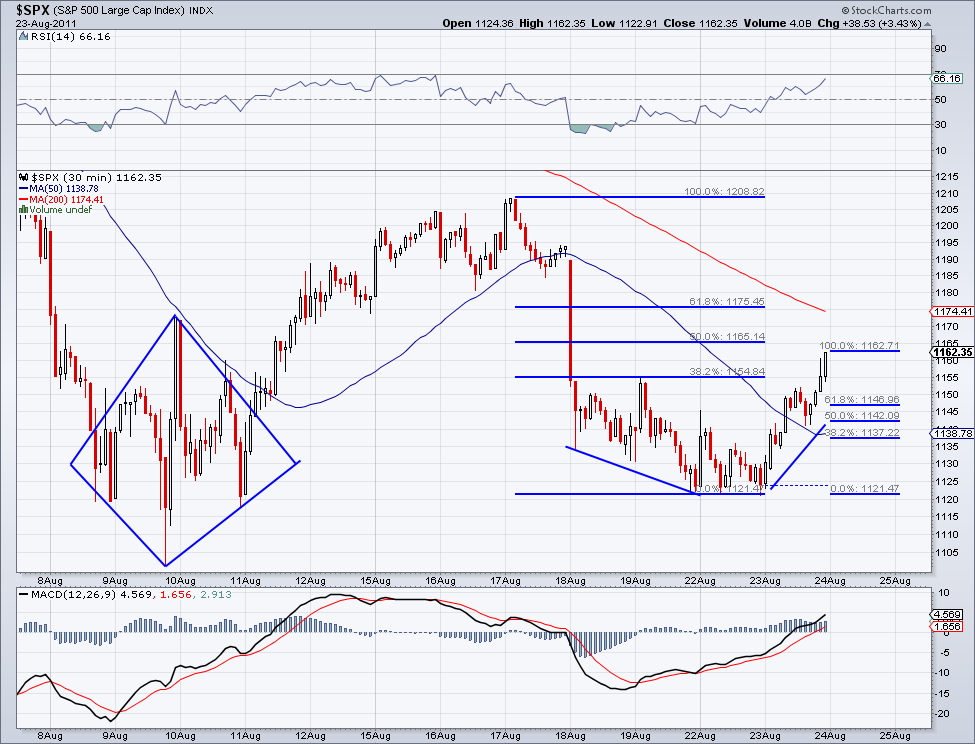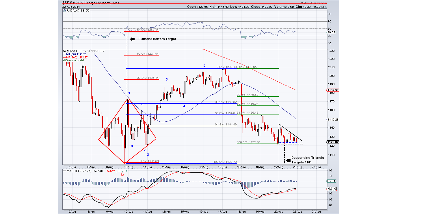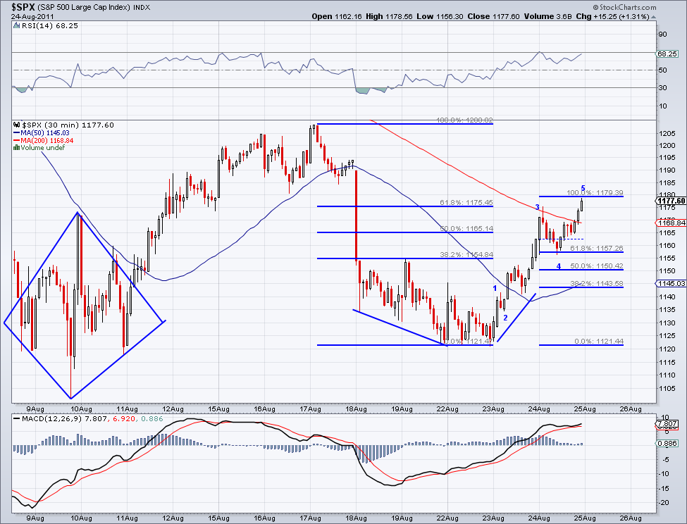 The market finally tested the TA today but failed to close above it. The last time the market traded above the TA was at 1328 or 142 points ago and the TA might turn positive next week so it remains to be seen how the rest of the current wave plays out and how it gets corrected. I was originally inclined to label the waves an ABC move after the 1101 low but in looking at the structure it seems to me like 5 waves so this could be an A or a W1. I think we should be able to tell on the coming bearish waves and if divergences develop. I am ready to jump in again should the market start trading above the TA and as a matter of fact I did today but I got stopped out at break even again. I've lost count how many break even trades I've had this week, must have been at least half a dozen.
