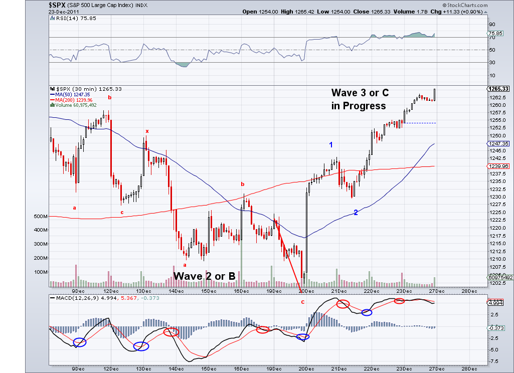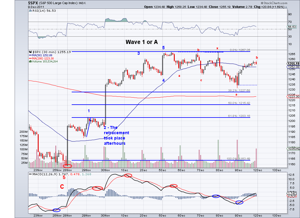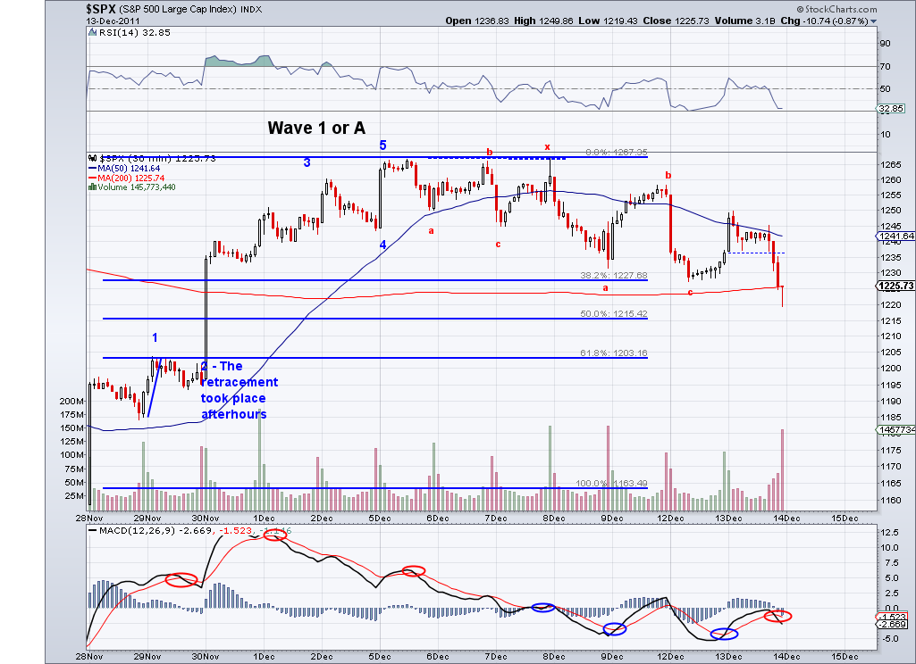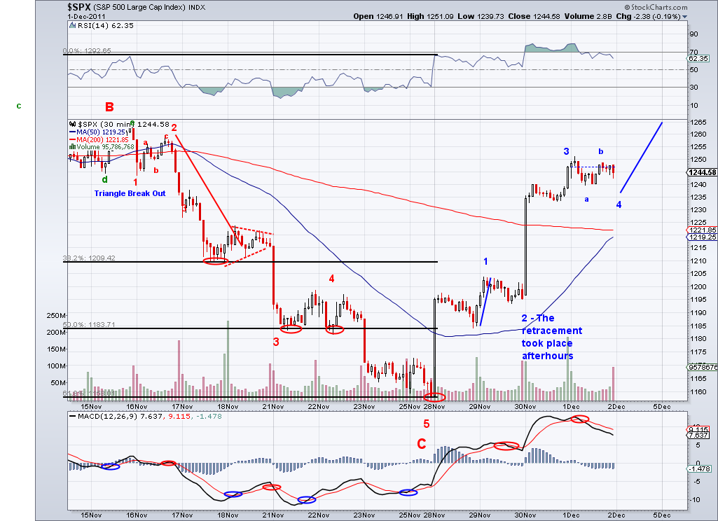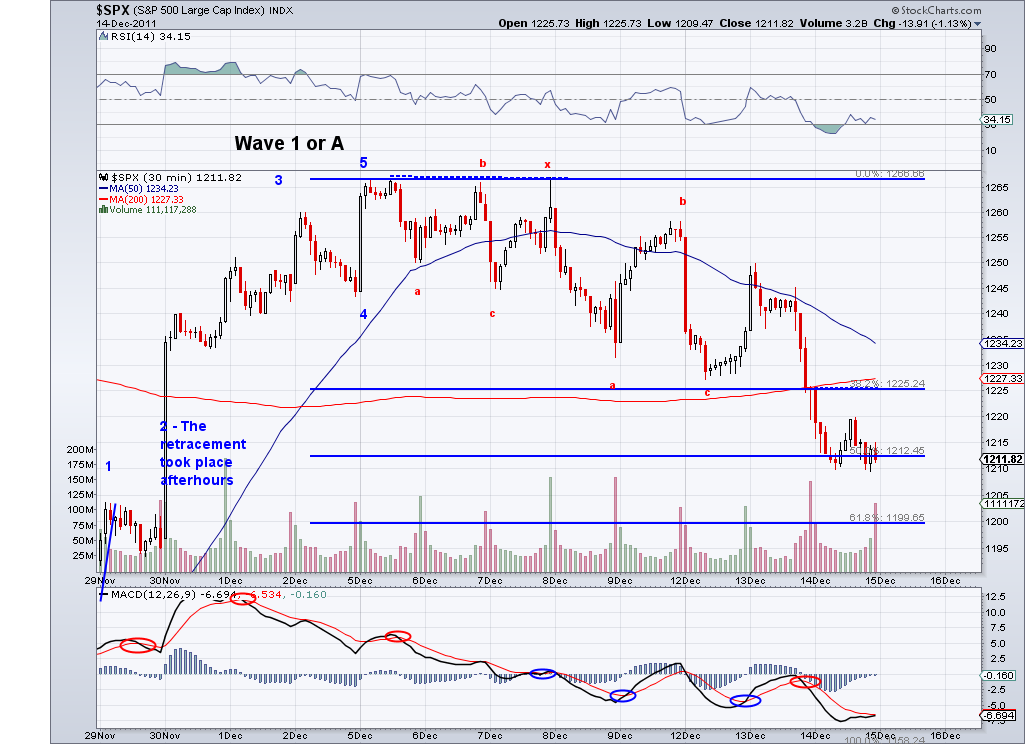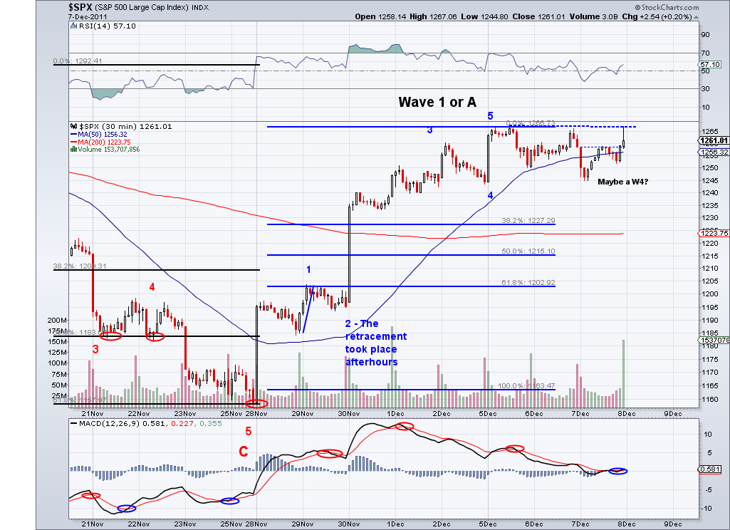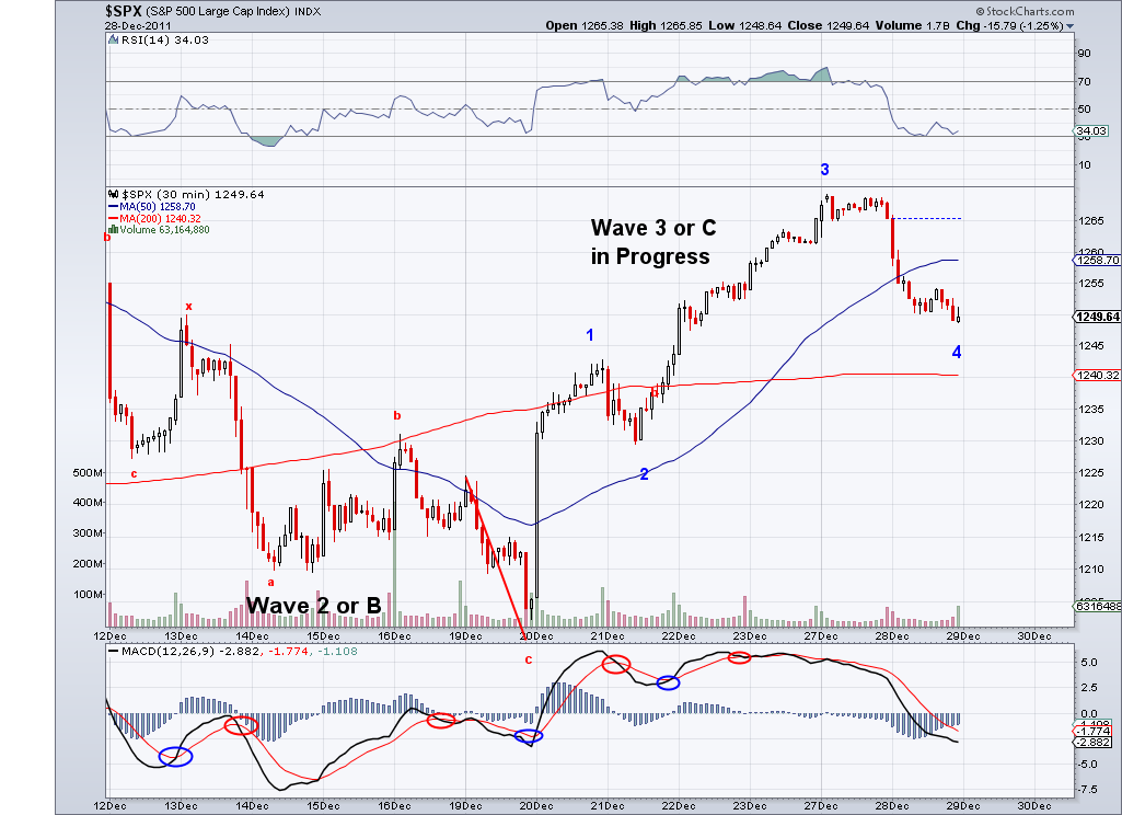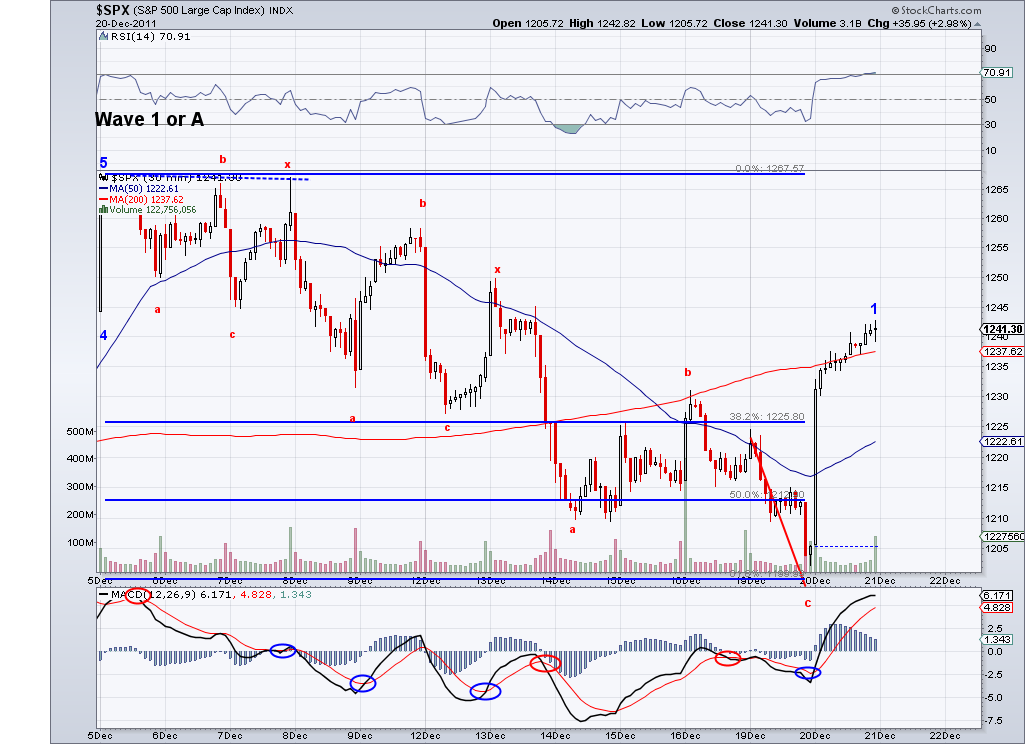 The market attempted to make a run towards the 200 day ma at 1265 and it almost got there in the W5 I was posted about yesterday. So I see now a 5 wave structure complete and the correction has started. Ideally, the corrective wave would take the market down to the 1197-1221 area before launching another rally to 1300+. Alternatively, the market could trade sideways to consolidate and then go to the 1300's. Whatever the case, December should a good month for stocks. I used the early morning rally to take profit on all margin positions and will be buying everything back at the test of the TA hopefully next week? I am hoping to see a big rally, sell all positions and end the year in cash. We shall see..