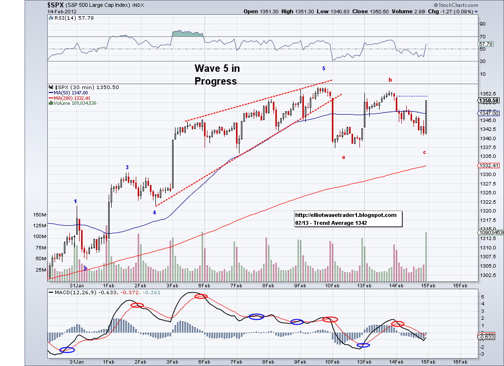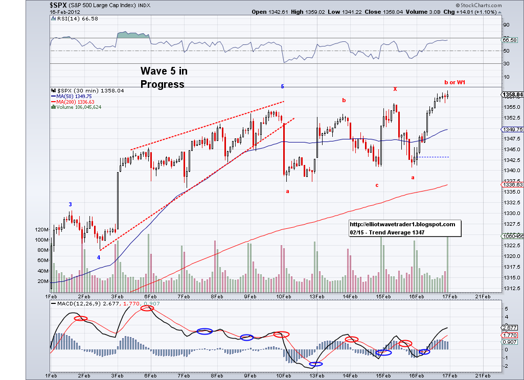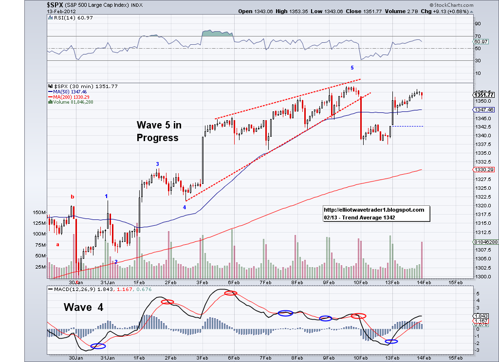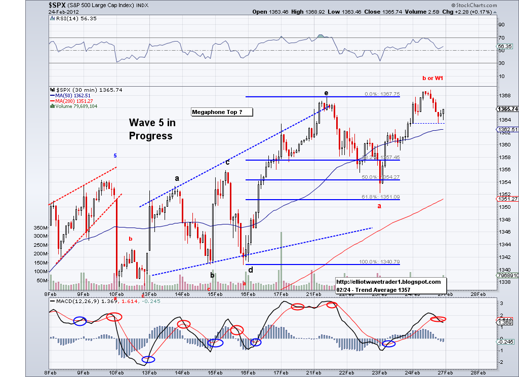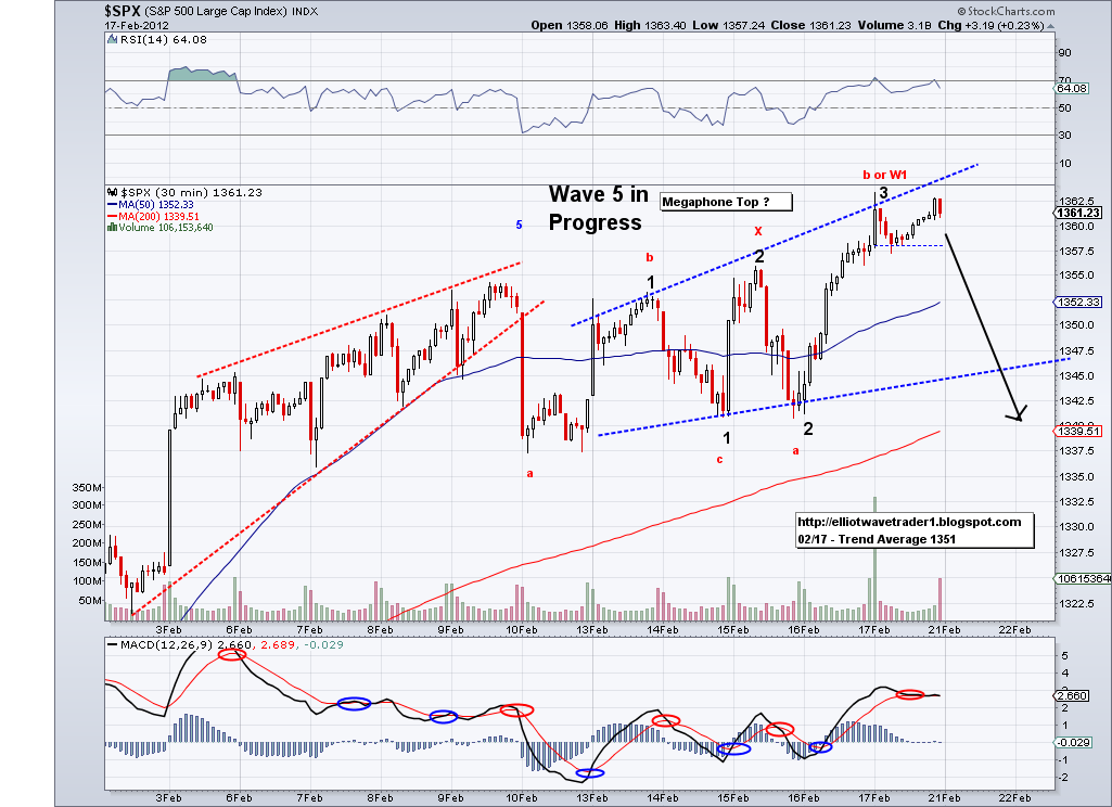 The market made it to the 1360's and it looks like it really wants to go for 1376 (1.618 of W1 or A). And although I am not surprised at the level we are in, the lack of normal corrections is what makes this leg unique. But as I have been saying, the odds favor a substantial correction so I am looking for this leg to start the correction in the next week or two. Also, there is a clear megaphone top or broadening top pattern in place. In fact, it's almost textbook so we'll see if the market topped today or wants to make that 1376 number and then go down. I executed my trade as planned and I bought the VIX at the open and sold it within 20 minutes, so that was the quickest 1% profit I've made in a while. And I remain short over the weekend. My thinking is if we go down Tuesday then it's good, if we gap up then I'll do the same exact thing I've been doing during all these morning rallies which have been working out pretty good considering the amount of successful trades vs negative ones as shown on the portfolio:
