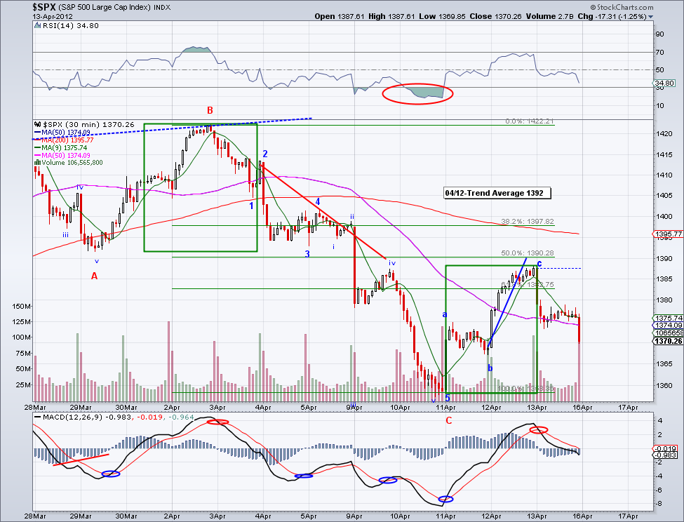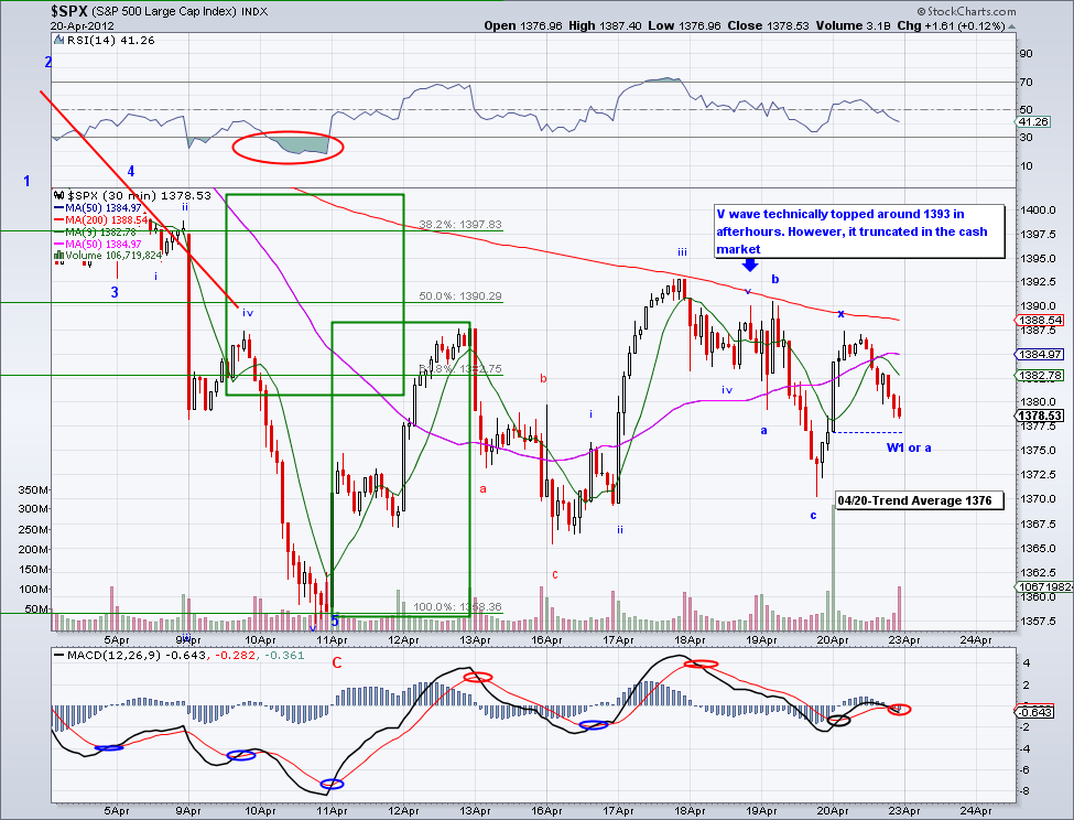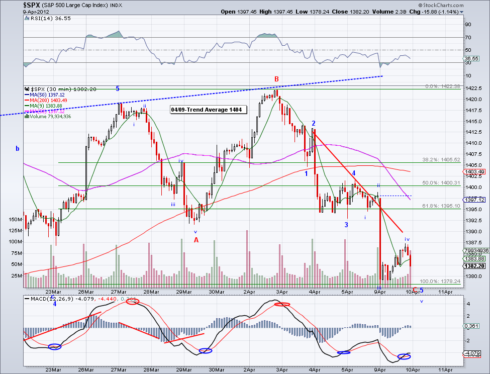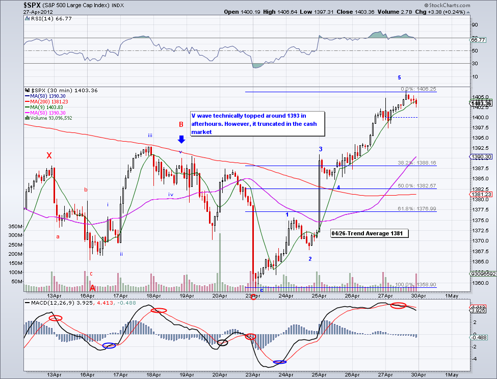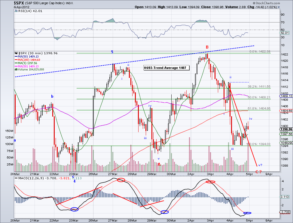 The market decided for the red option posted yesterday but so far 1391 has held, so optimists need to come out buying tomorrow or else the trend will start to turn. From the wave perspective I only see 3 waves down so we would get a better guidance if we saw a 5th wave materialize tomorrow and take out today's low and perhaps 1391 along with it. We now have clear catalysts to initiate a substantial correction (end of Fed help, Spain bonds) so maybe we'll finally see a true sell off. In a way the bull argument is getting difficult at this point, if we get good economic numbers then it reinforces the notion that the Feds will no longer intervene and start raising rates. On the other hand, if we get bad numbers then the possibility of an economic slowdown will hit the market especially since Europe and China are slowing down. My most optimistic prediction from early December 2011 is now a reality and I think it's time we get back down to 1300 or perhaps the 200 day MA?