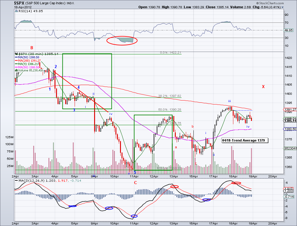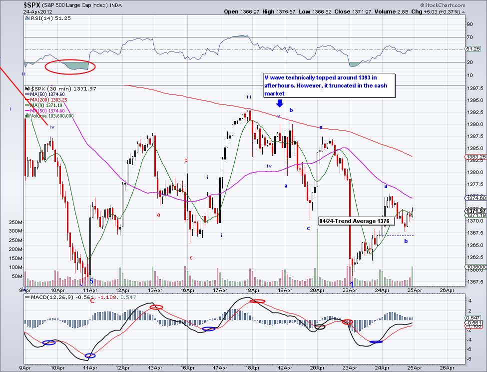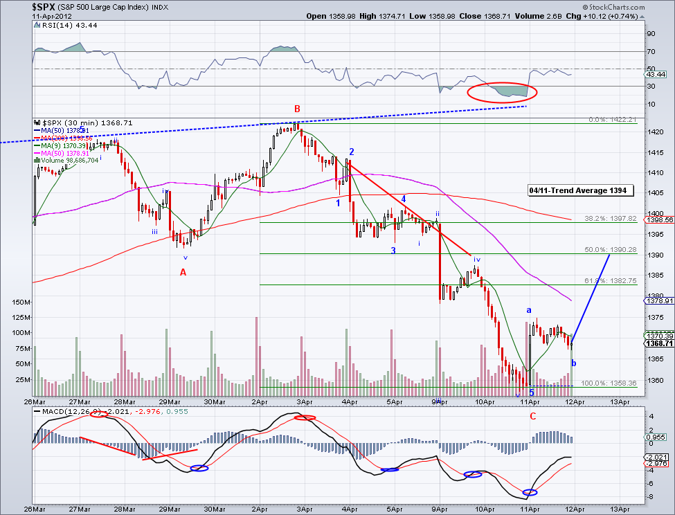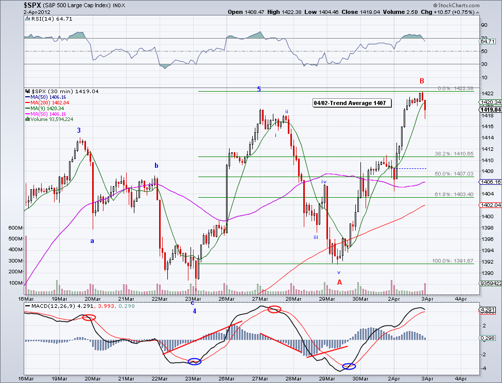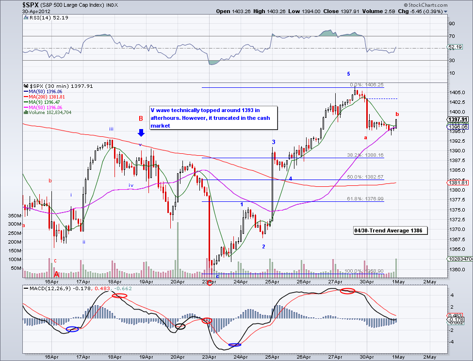 The market decided for the red option posted yesterday but so far 1391 has held, so optimists need to come out buying tomorrow or else the trend will start to turn. From the wave perspective I only see 3 waves down so we would get a better guidance if we saw a 5th wave materialize tomorrow and take out today's low and perhaps 1391 along with it. We now have clear catalysts to initiate a substantial correction (end of Fed help, Spain bonds) so maybe we'll finally see a true sell off. In a way the bull argument is getting difficult at this point, if we get good economic numbers then it reinforces the notion that the Feds will no longer intervene and start raising rates. On the other hand, if we get bad numbers then the possibility of an economic slowdown will hit the market especially since Europe and China are slowing down. My most optimistic prediction from early December 2011 is now a reality and I think it's time we get back down to 1300 or perhaps the 200 day MA?