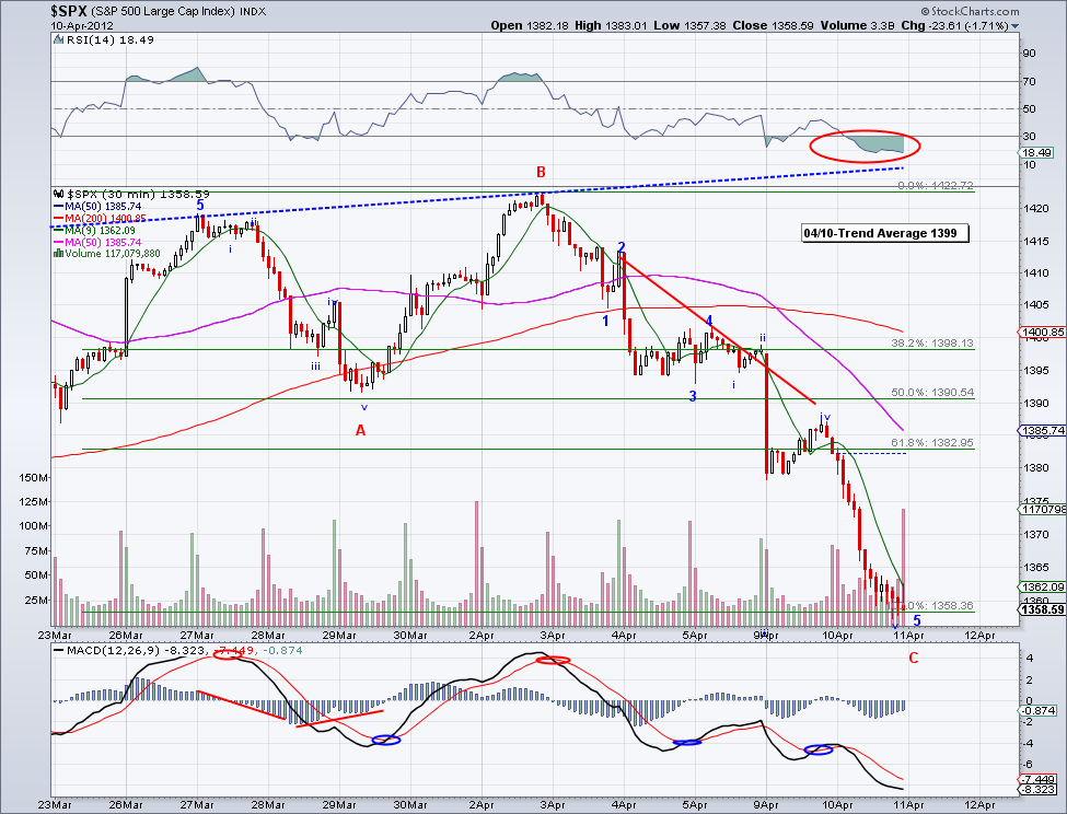 Today's price action should leave no doubt in anyone's mind that the bullish trend is broken, technically speaking it broke last Thursday per my trend change post and now the question in everyone's mind is where is this going to bottom. Per my count, which I've had since I had the 1420 target we're in a C leg of an expanded flat. This C leg stopped today at the 1378 level (a level I've mentioned before) and just short of 1.618 of the A leg. However, in looking at the waves I can see more downside so we'll see if this will materialize in the cash market. The ideal bottom for this leg would be 1366 but it could well stop at the 50 day MA at 1371 and from there we'll see the "X" leg before another 5 waves down. Technically speaking we are in a W4 correction at this point and I am not expecting a strong sell off. However, I would assume the market will zig zag ideally to the area around 1297 and start a bullish 5th that should take the market to 1500+.