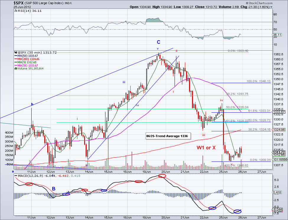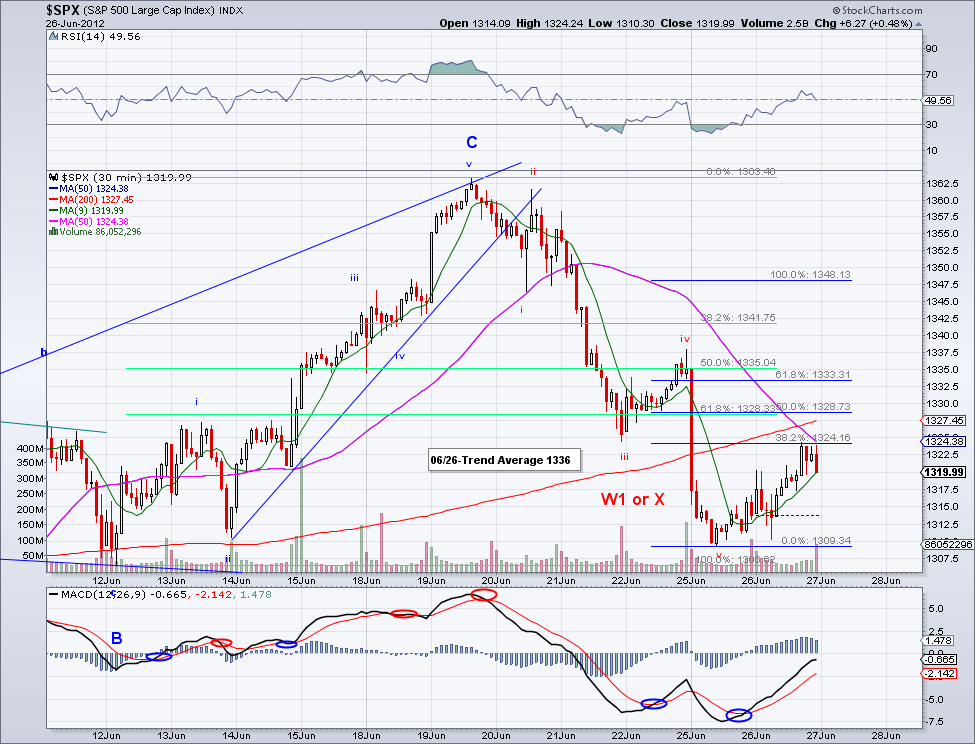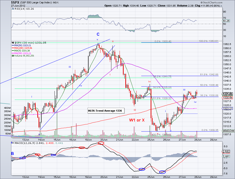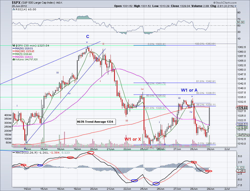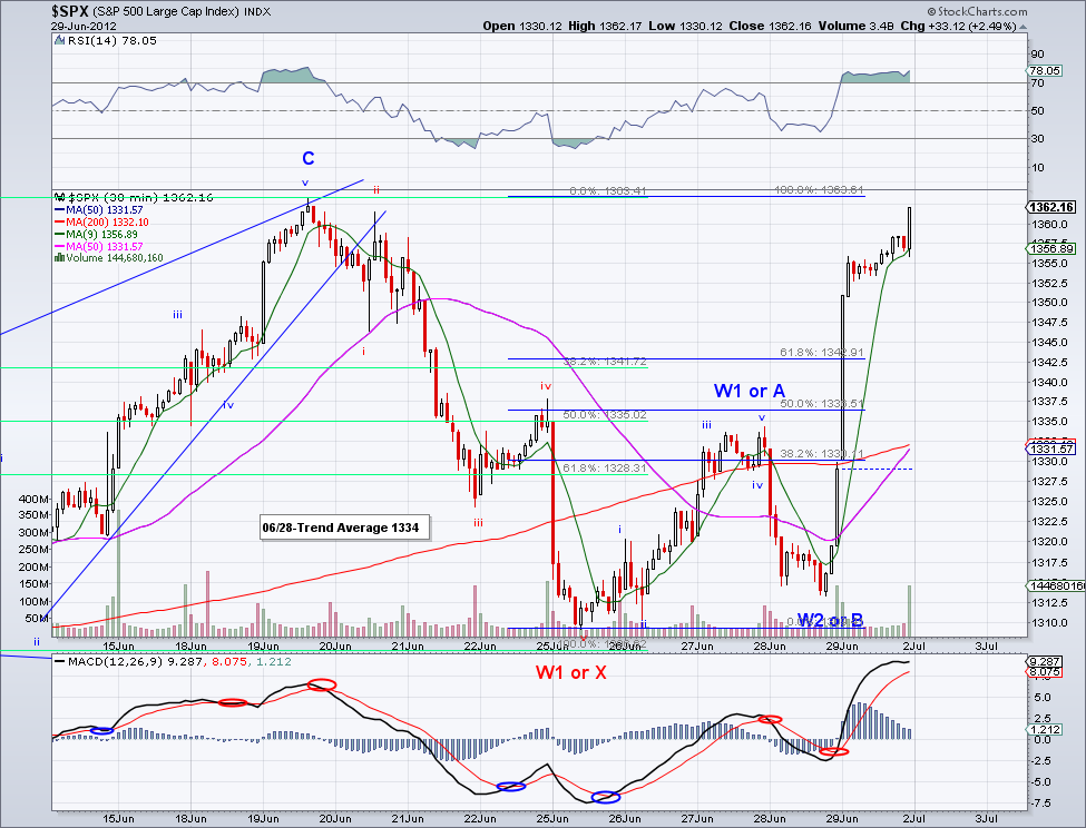 It is almost like the market read my post yesterday... The market started one of the strongest bullish W3s this year and flew by the trend average, the 13 day EMA and the 50 day MA without blinking an eye. I know the excuse for the rally is not all that convincing (allowing Spanish and Italian banks to borrow from the fund) but to me what really drives the markets long term is investor sentiment and not these types of news. To put things into perspective and not get sidetracked by all the "noise", catastrophic wave counts and predictions. This correction that started in April is now almost 3 months old and in all this time the bearish advance has been a total of 60 points!.. 1422-1362. The bullish wave preceding it was 4 months old and advanced 264 points 1160-1422. During this correction the market dipped below the 200 day MA just for a day before bouncing bank, signaling investors were waiting for a 200 day test to jump in. Unlike last year where the market sold off hard after the 200 day MA was lost. And unless the market starts trading under 200 day MA, my assumption is that the market is going up. I am aware of bearish wave counts targeting 1200, 1100, sub-1000, etc. but at this point trends don't support that. If anything, we're more likely to see new highs fairly soon once the intermediate trend turns bullish (which should be sometime next week if the 1340 level holds).