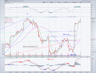 The market found the fuel overnight to rally past the 50 day MA today and if advance can clear the 1360-1365 area then there is a good chance the next stop is the 1385-1390 level. But for now the market is overbought (it has advanced aprox 100 points from the low and we're just about 60 points for a new high for the year), so I am still expecting a correction to the TA or 50 day MA as soon as tomorrow. But this being a bullish W3, it has the freedom to extend and turn the market very overbought before any meaningful correction. So I wouldn't recommend being short expecting a market collapse (for those that assume we are about to witness a cataclysmic sell off) since all indicators are bullish or about to turn bullish. If the market was trading under the 200, 50 MAs AND its Trend Average then being short would make more sense to me. But for now, I am holding to all my longs until the market reverses the trend or we hit an extremely overbought spot.