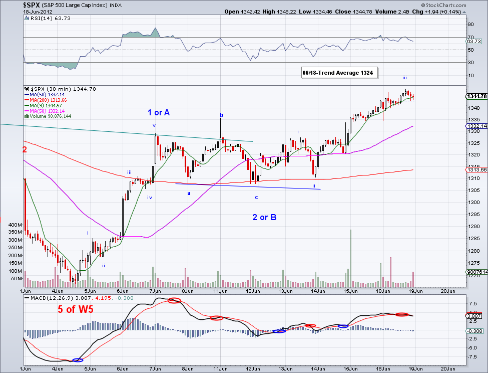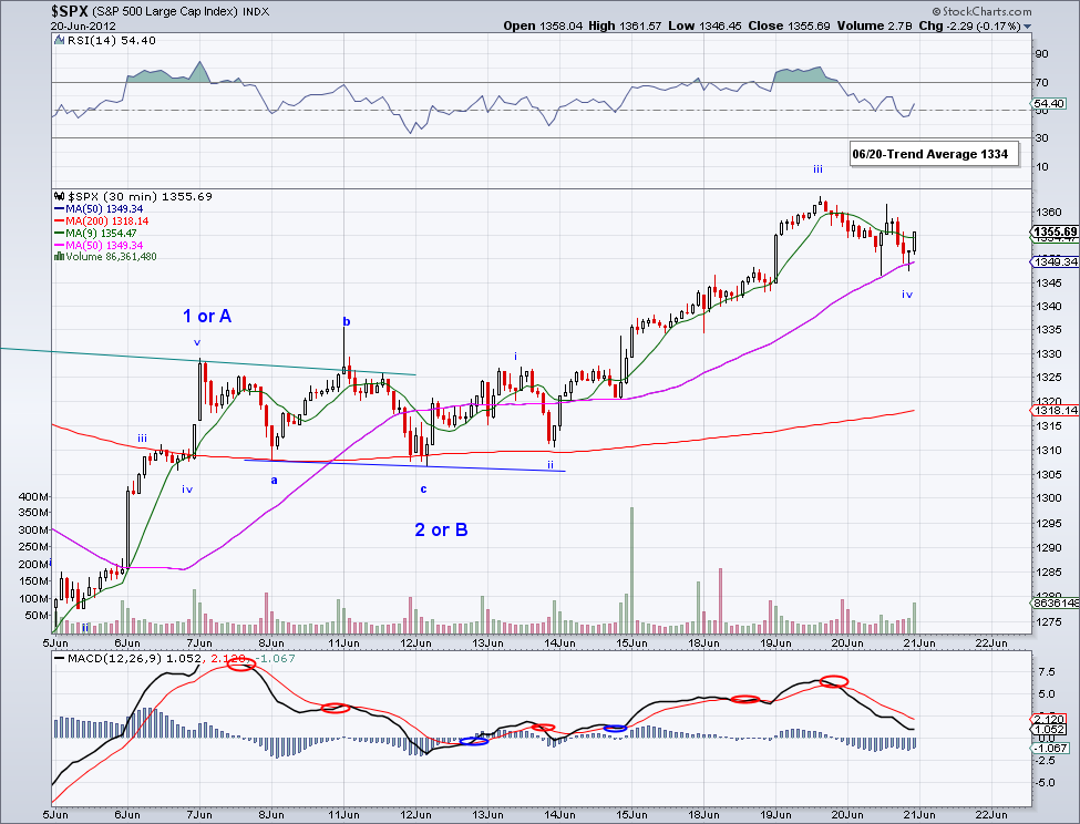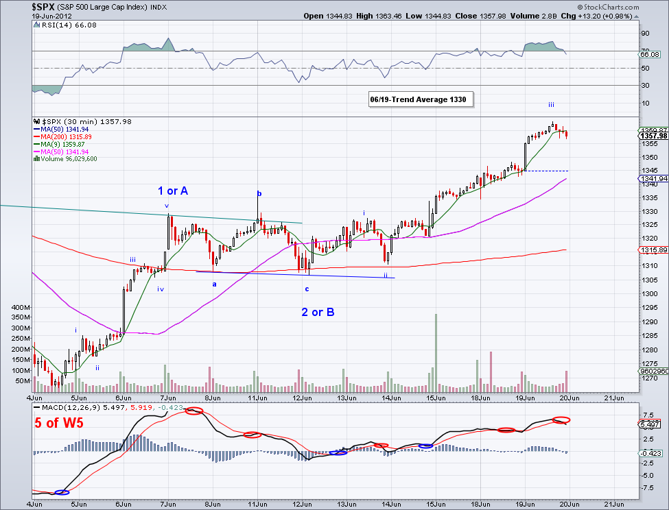 I had an emergency and had to go drive out of town and back but I still want to give an update for 6/20. Basically the market did what I was expecting, which is the test of the 50 day MA and so far this level has been holding well. So if tomorrow this level doesn't break then I expect the market to make a run towards the 1365 to break resistance, which would go well in line with a W5 to finish up the impulse wave from 1266. And like I said yesterday, if the 1365 level breaks we're on to 1385-1390.
