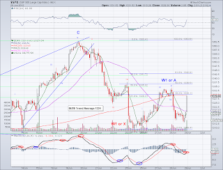 The market put in a 5th bearish wave today completing what appears to be an X or W1 wave. The trend average served as resistance last past week and any coming bounce will have to overcome the TA in order for the bullish to take hold. If the wave that finished today was a bearish W1 then we'll probably see much lower prices after the bounce so I am going to hedge my longs at the test of the TA in case the bounce turns out to be a W2. With that said, we still trade above the 200 day MA so this continues to be a correction within a bull market.