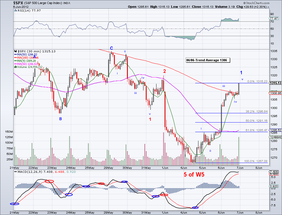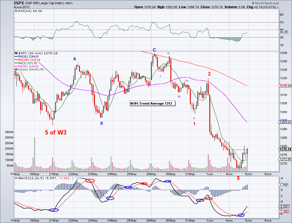 The market seems like it can possibly break out of its range as soon as tomorrow after today's action in the last hour. But obviously, nothing is firm until 1335 is taking out decisively. The excuse for a break out would probably be the increased possibility of more Quantitative Easing so any more data that suggest weakness in the economy will actually be good for the markets. I know a lot of people complain about the central banks intervening in the markets but as long as they keep assets nominally elevated, then numbers look good to most people. And that is the main reason we will never see any catastrophic crashes in the market like the so called "Primary 3" per some Elliott Wave practitioners.