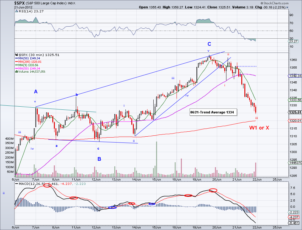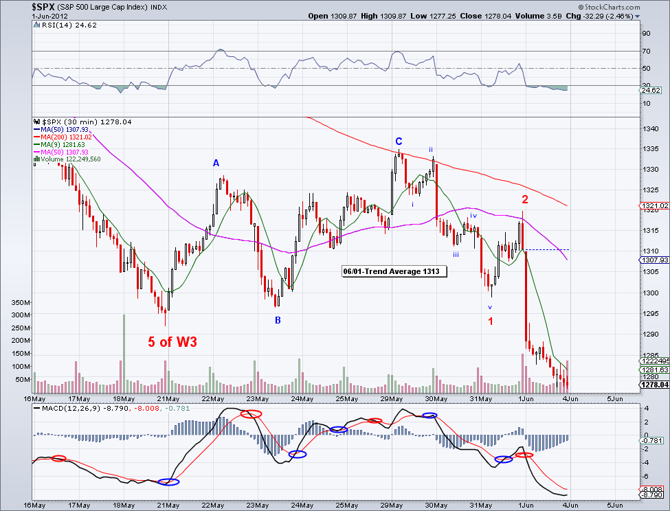 The market seems to have to put in the low for its bearish W3. However, whether it is W3 of a W3 or the actual W3 needs to be seen in the days ahead. As a wave rule, the bounce from the low today can not exceed 1298 and if that happens to be the case then we'll probably get at least a 37 point bearish wave from the W4 top to finish up the 5 wave move from 1417. Where it ends doesn't matter that much IMO, what really matters is if the market is able trade above the 200 day MA when the real bounce occurs.
