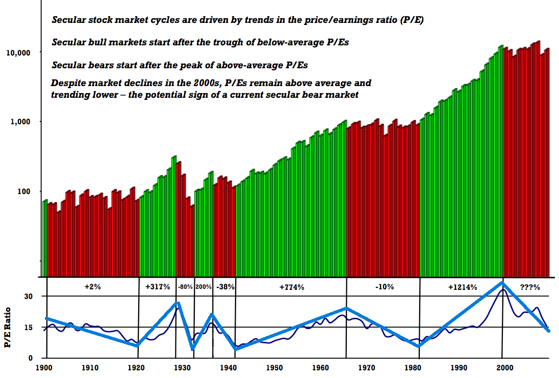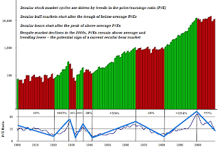 The market went down as anticipated and it did not even enter the 1300-1310 area, which in turn has caused a higher low and potentially a base for a bullish W3 wave. Obviously, it's too early to tell at this stage since key support and resistance levels have been holding. But it looks to me like the market has the intention to rally over the Trend Average and perhaps the 50 day MA which will likely turn the intermediate trend bullish. So if you're short, watch for this as it can save you a lot of headaches and $$$. Also, I wanted to post a chart of the stock market expansions and retractions over the last 100 years relative to P/E. Notice the market heading into a sub 15 P/E ratio (it is currently at 13) on the chart and how these ratios have retraction and expansion cycles. Going by these numbers, there is a very good chance that we have been in a correction within the larger trend for the past 12 years and if history serves as a guide we are probably about to embark in a major bull market sooner rather than later (talking about yearly time periods). Everything comes in cycles and I think the corrective cycle in the bigger picture is about done..