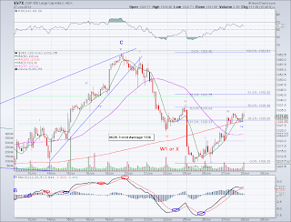 The market bounced as expected today and found resistance exactly at the 38.2% retrace of the X or W1 wave at 1324. So now we'll see how much more strength this bounce before resuming another bearish wave to test the 1300-1310 level which so far has held up fairly well despite several bearish attempts. And if the bearish wave fails to beak this support area we will most likely then test the 1363 wave high again. The market looks undecided at this point which actually favors the bullish case as long as the over all trend is positive. Perhaps the market is waiting for more EU information before making its mind.