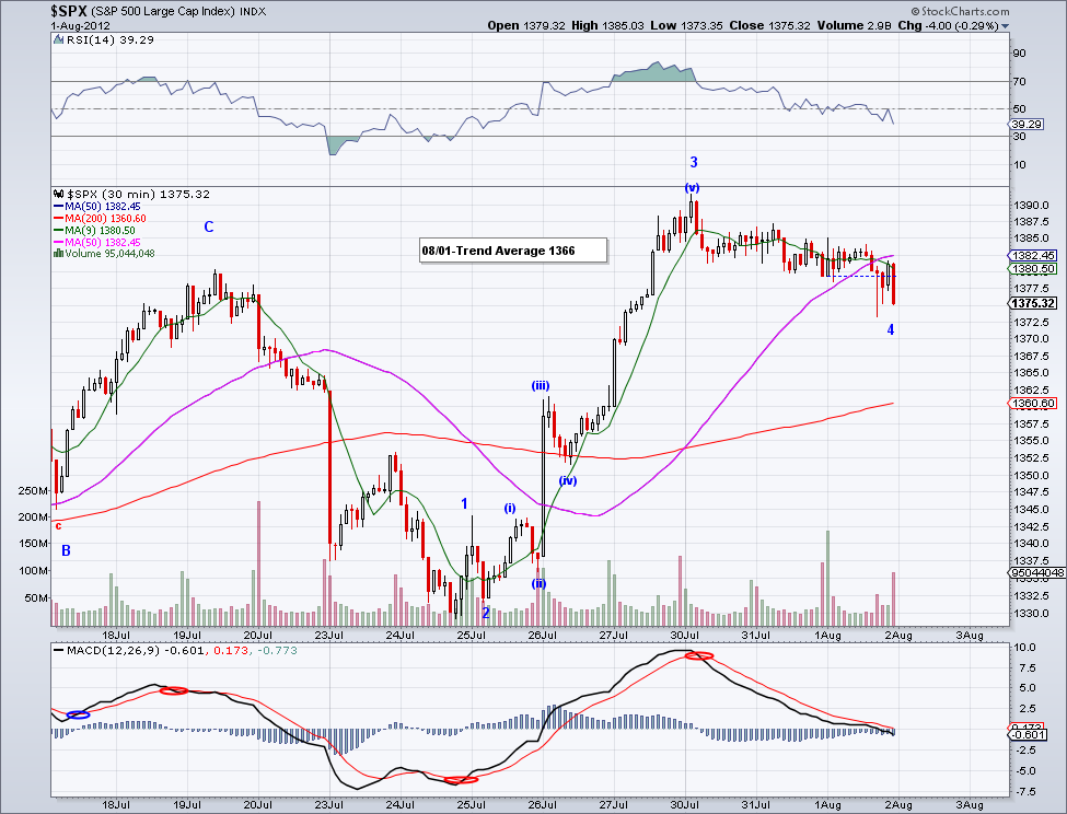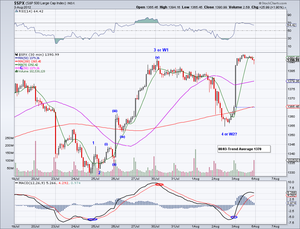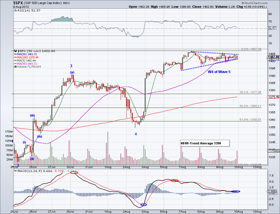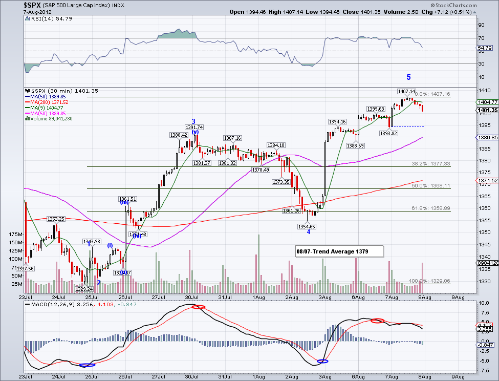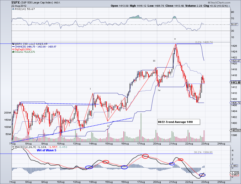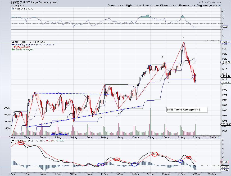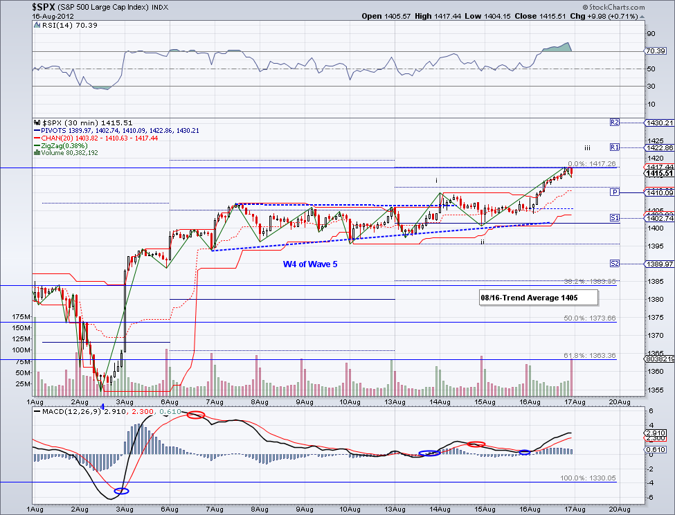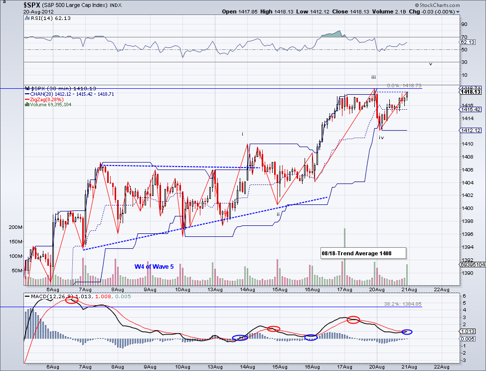 The market put in a W4 on the minute count on the chart and W5 should be in tomorrow or in pre-market. And we'll see if the market can overcome 1422, if W5=W1 we actually get 1422.. and then we should see the bearish response that will probably set the tone for trading in September. If the market is able to find support anywhere above the 50 day ma, the market is likely to continue to new highs. If not then down we go but I hope the market is making a turn for the positive as an indication that our economy will start doing better next year.