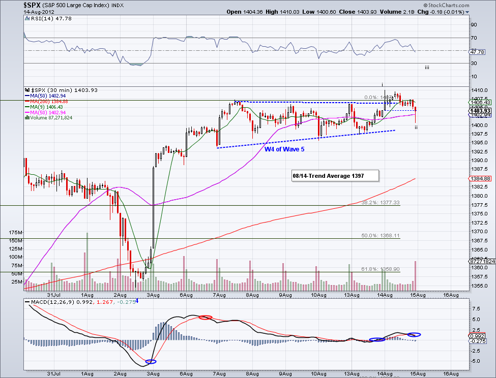 The market finally made a stronger move today and made a lower low for the correction that started 8 trading days ago. It seems like the market is trying to price out any potential disappointment on the QE3 announcement, however the bearish move was held by support and this still continues to look like a W4 until 1391 gets taken out. Tomorrow should get interesting..