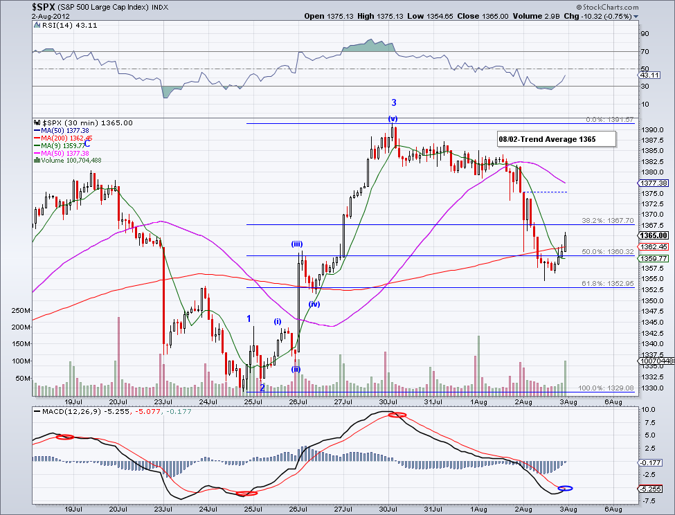 The market finally closed under the trend average for a second time today, so we could technically label this as a confirmed bearish short term trend change. However, the only issue I have is that the TA has not started sloping down yet one could make the argument that we need an extra bearish day for a valid confirmation. And I think we will see that extra confirmation tomorrow as the bounce wave seemed to have topped today and there is a bearish MACD cross on the 30 min chart. So I am watching just how strong this coming bearish wave will be. If it looks like the ABC wave from 1426 then we will have a double ZZ and the correction should end around the Fib retracement area/50 day ma. However, if we see a strong sell off then we might be in for a much stronger correction that will challenge the 200 day ma. For now, I continue to hedge my longs so we'll see what the next few sessions will bring.