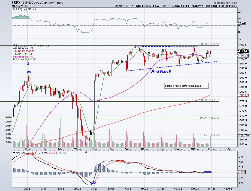 Few days ago I mentioned the market was likely to test the trend average after making some sort of top and today the market corrected 20 points to 1406 before bouncing to its Fib retracement level and closing above the TA. It still remains to be seen just what kind of correction this is (or was) as this could well turn into yet another W4 correction before putting in another W5 high. Alternatively, it could be setting itself up for a bearish leg that will start closing under the TA. Today's chart reflects the differences between using wave counts vs trend averages. If I were just counting waves, I would assume the leg from 1426 to 1406 was an impulsive wave and that we are now on a W2 or B wave before seeing a bearish W3 or C wave. However, looking at the trend average and the MACD (which is moving average based) indicate the market remains bullish and is ready for another bullish wave as soon as tomorrow morning. In my experience, odds usually favor moving averages so I'll assume the market is trying to go over 1420 again. Also, gold broke out today out of an apparent ascending triangle and that confirms the markets are trying to price in QE after the Fed statement so this could well spill over onto the stock market at any moment.