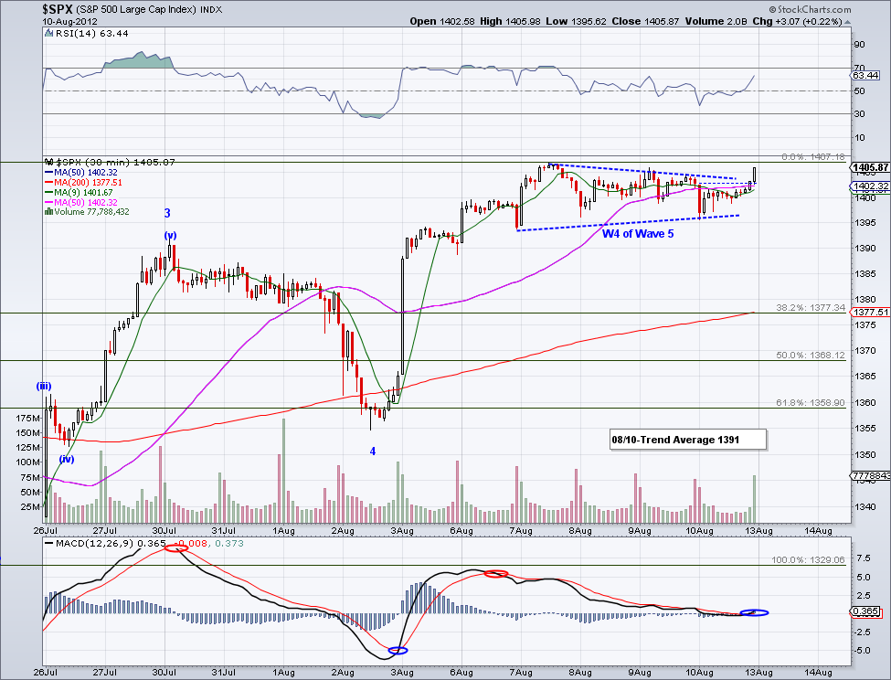 The market took a breather today as expected but it is now in a triangle, which implies this could just be a W4 of the 5th wave. And if this is the case, we should see another bullish leg tomorrow morning. If not, then I expect the market to correct to the trend average at the very least which has now climbed up to 1385. Oscillators have reset enough for a new bull wave so we'll see if the market can challenge 1415 and eventually 1422. I wanted to trade today (short to hedge) but the only chance I had was early morning while I was still sleeping.. oh well.
