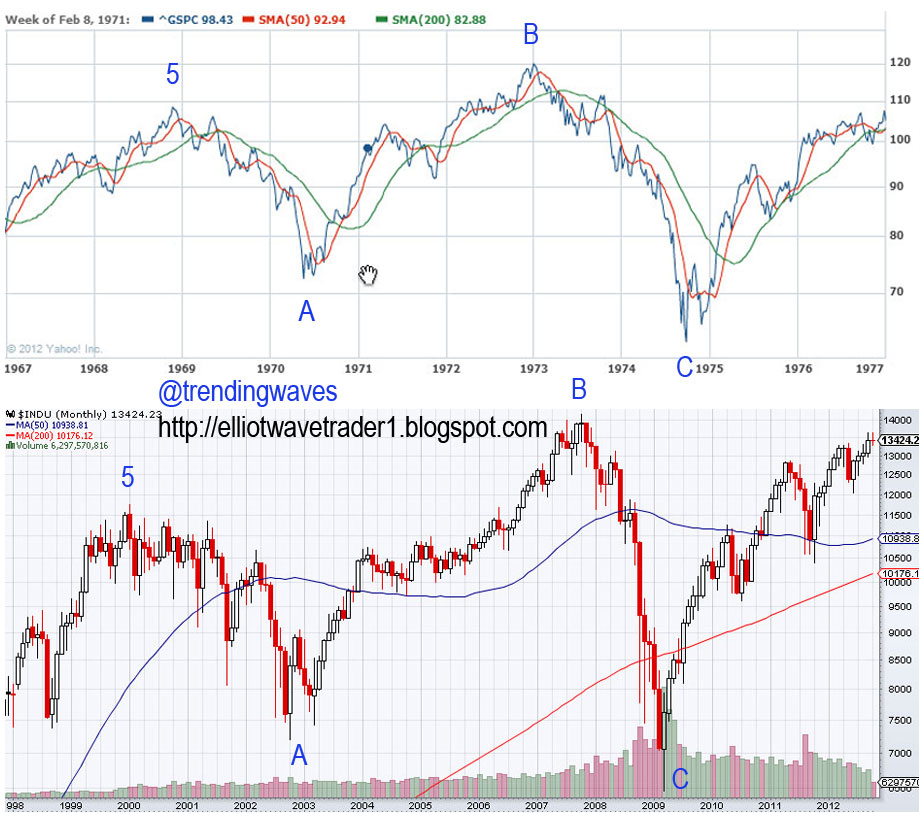 What has happened since WW2 is the market going up in strong W3 like rallies that are broken in 5 waves. After these strong waves, markets have either consolidated sideways in multi-year corrections or have dropped and recovered quickly. In looking at the charts, the last time we had a multi-year sideways correction was the period I posted on the chart (before that was in 1955-58). And if you take a clear look, years from 1967-1977 are almost identical to 1998-2012. The US dealt with long wars, recessions, high unemployment, high oil prices, etc. But what happened after the 1977 period was a couple of years of slight higher highs and lows before breaking out of the pattern and tripling in price within 10 years time, this after being stuck in a trading range for almost 10 years. So now we find a very similar situation and there is a good possibility markets are about to break out of the pattern and go up for 10 years as other breakouts in the market in the past. And while I understand there are many bad news around, how do you think the news were in 1977? they were dire but look at what happened. Also, one index that might give us a clue is the Russell 2000. It is close to breaking its all time high and should this index break out of the pattern so will other markets. The RUT has always made a new high along with the other markets, so odds are if the RUT makes a new all time high so will other markets.