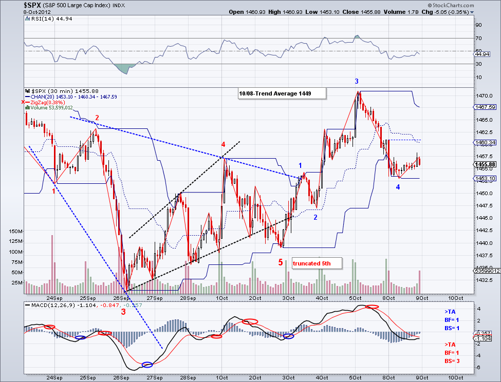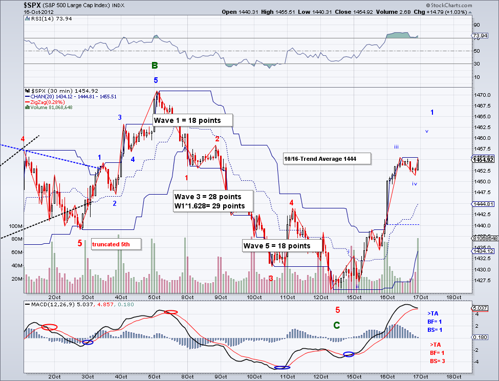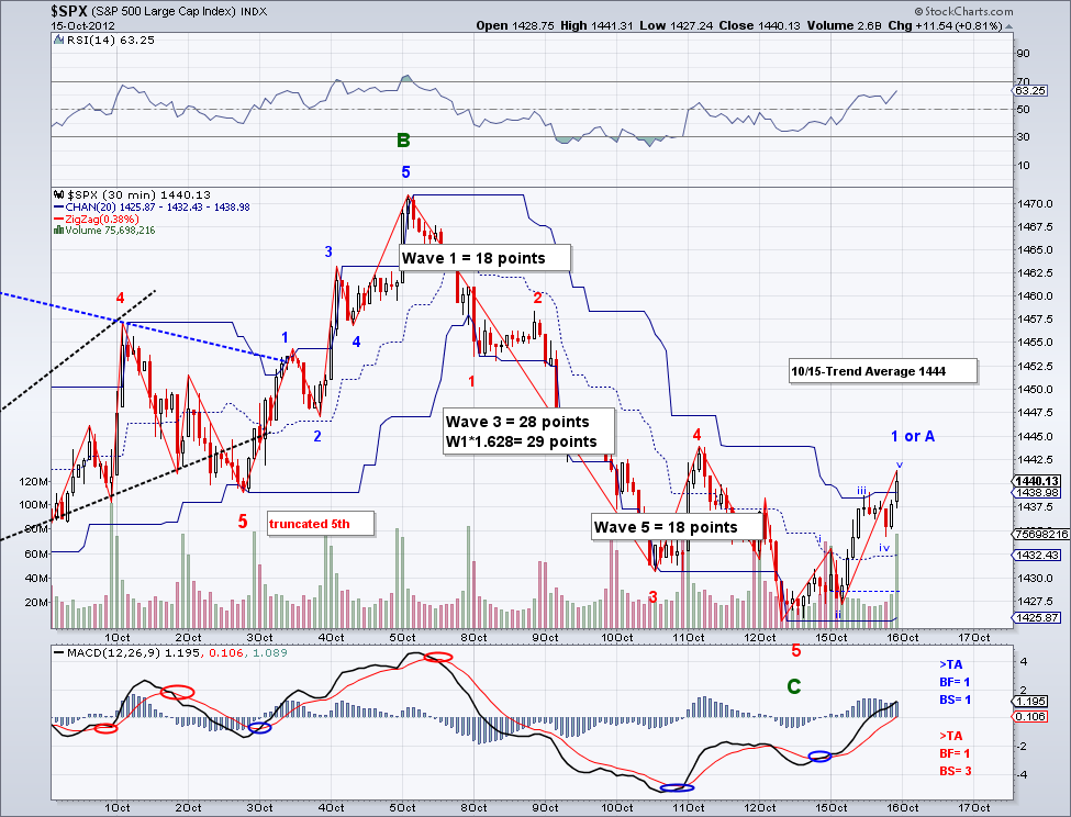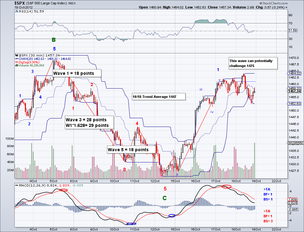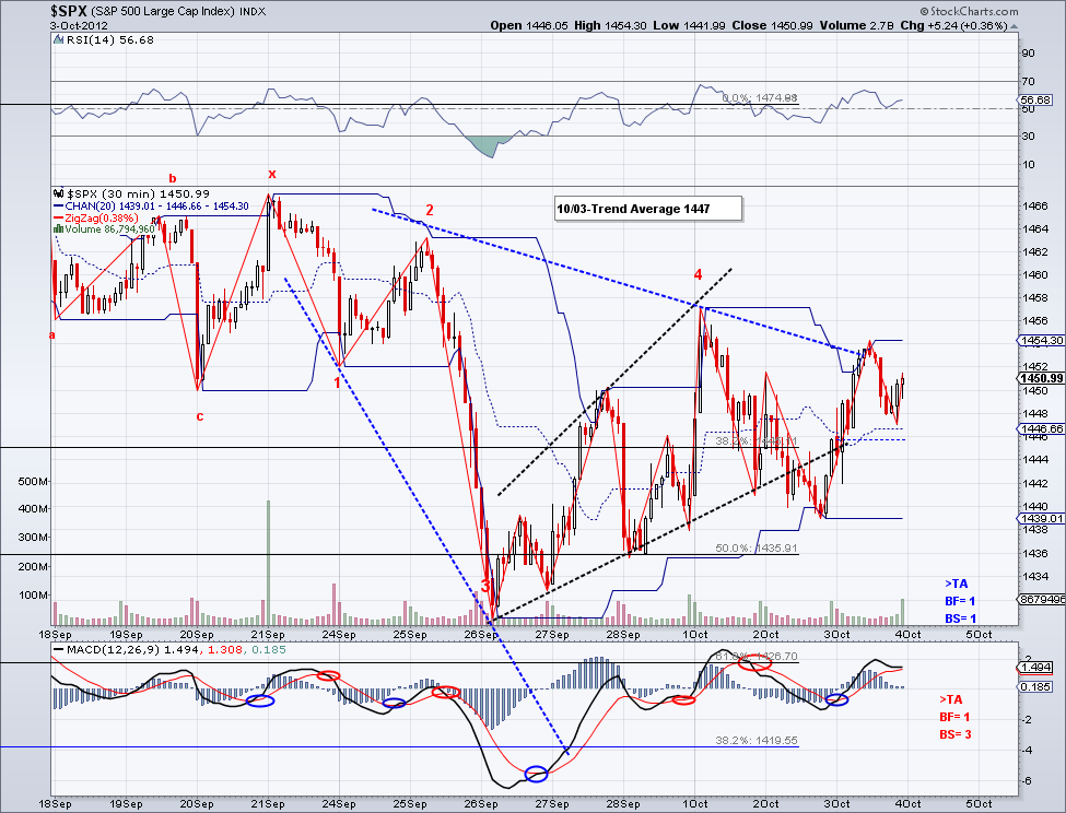 The market closed up again today and the market is again short term bullish. And my hunch that the 5th on the bearish wave was going to get truncated a few days ago turned out to be correct. So now we are potentially seeing the bullish wave that will make a new high for the year. Where is the market headed is anyone's guess given the Q3 environment but as long as the trend is up, the market will continue to go up so I would advice people who are still trying to short this market to do it only under the Trend Average or very carefully. I've been saying this since June and those who didn't believe in my simple and free TA system are paying for it. The market is setting itself up to challenge 1500, a level many people thought impossible not all that long ago.