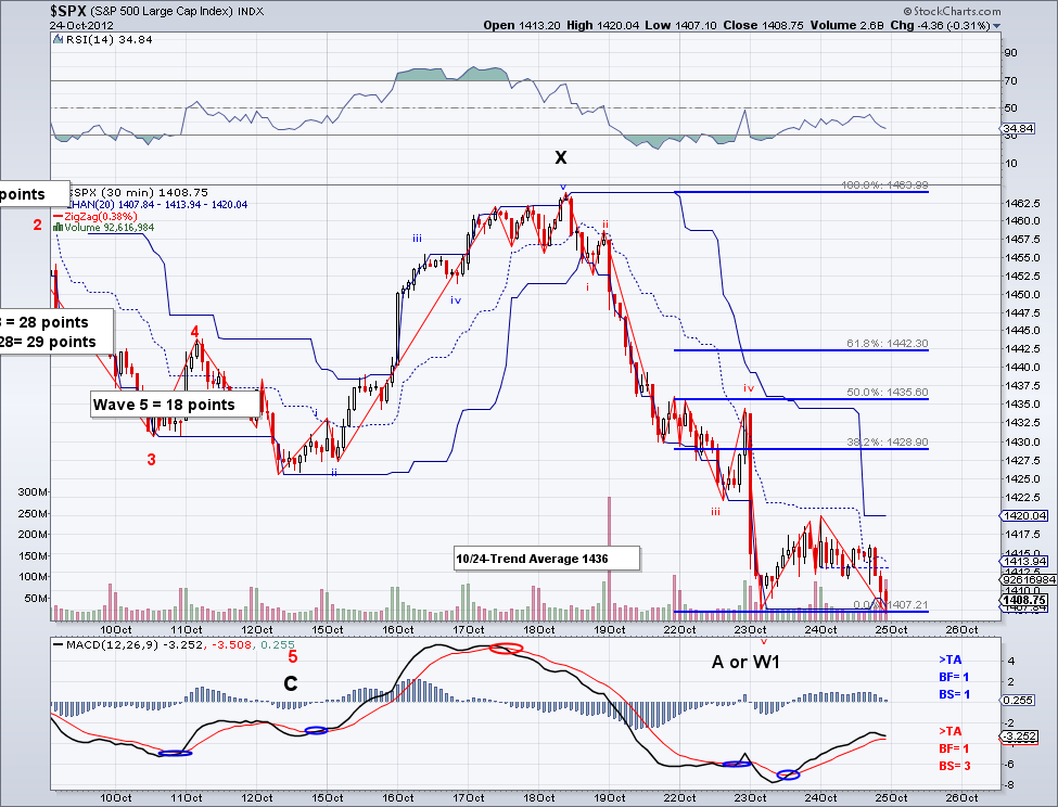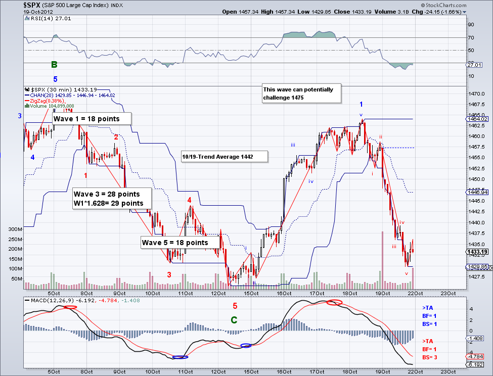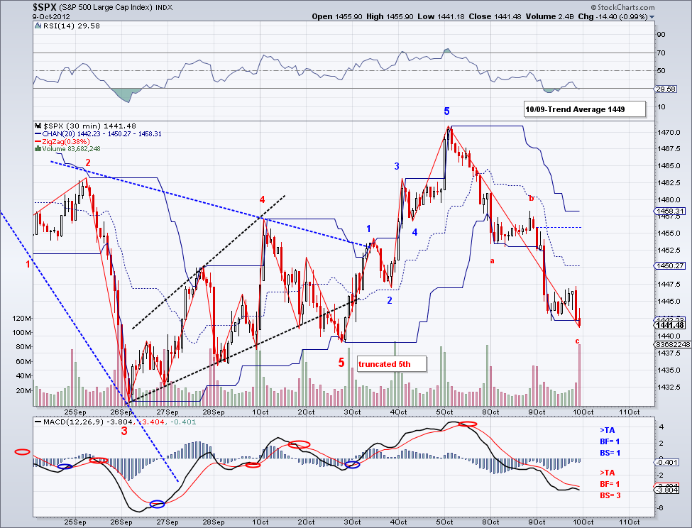 The market continued its sell off today and in turn invalidating the 5 wave count I had been following. It does seem however that there was a 5 wave count on the last bullish wave and current sell off remains a correction until critical levels are breached. Some important key levels to watch are a) 1439 and b) 1430. If these levels break then the market is going for the 50 day MA for sure and even the 200 day MA at 1366 as of today. But assuming we are going much lower is still premature until the trend actually changes. The market closed somewhat comfortably under the trend average and it remains to be seen if the market can re-capture it on the next bullish wave.