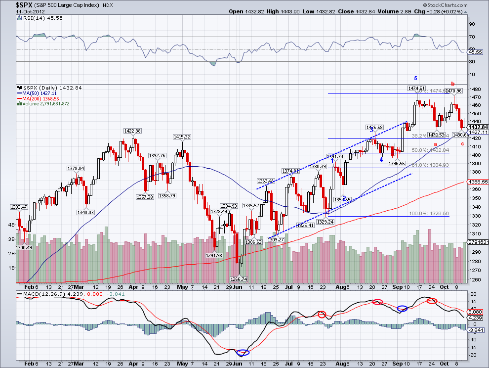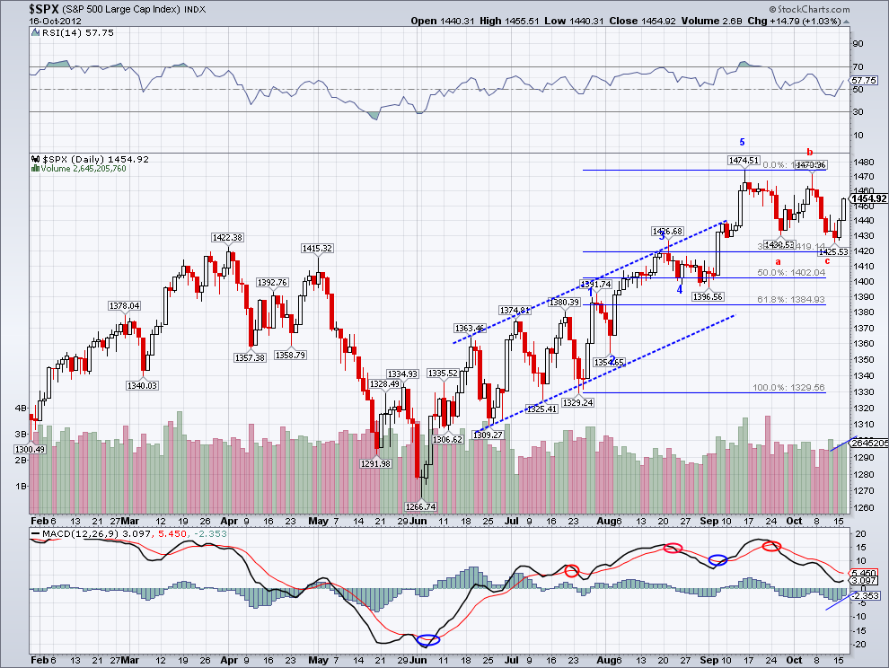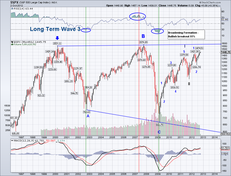 I wanted to post these charts tonight so you guys can think about it. I would never trade based on a long term Elliott Wave chart but it's good to have this possible outcome in mind as it can literally make you (or save you for that matter) a lot of money. I'll post more tomorrow on what are some of the events that support a break out of this pattern the markets are in.. I'm watching Obama and Rommey going at it.