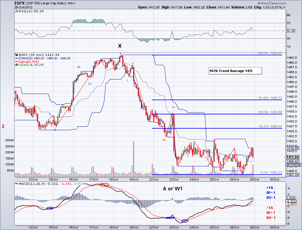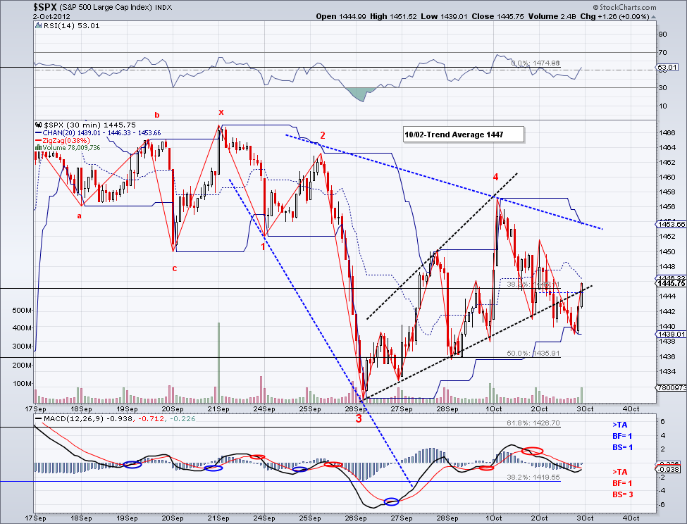 The market continued its bullish W3 earlier today but it seems to have faded on a W4 after the initial morning rally. And although the SP500 came close to its 4 year high, the DOW made a new high already and in turn confirming the likelihood of a continued rally to higher highs as I speculated few days ago. One level I am watching carefully is the 1454 W1 high so we can have a good 5 Wave impulse to the upside. We have a bearish cross on the 30 min MACD but these usually happen on W4's, so ideally we would see a rally on Monday to challenge the year high again for the W5.