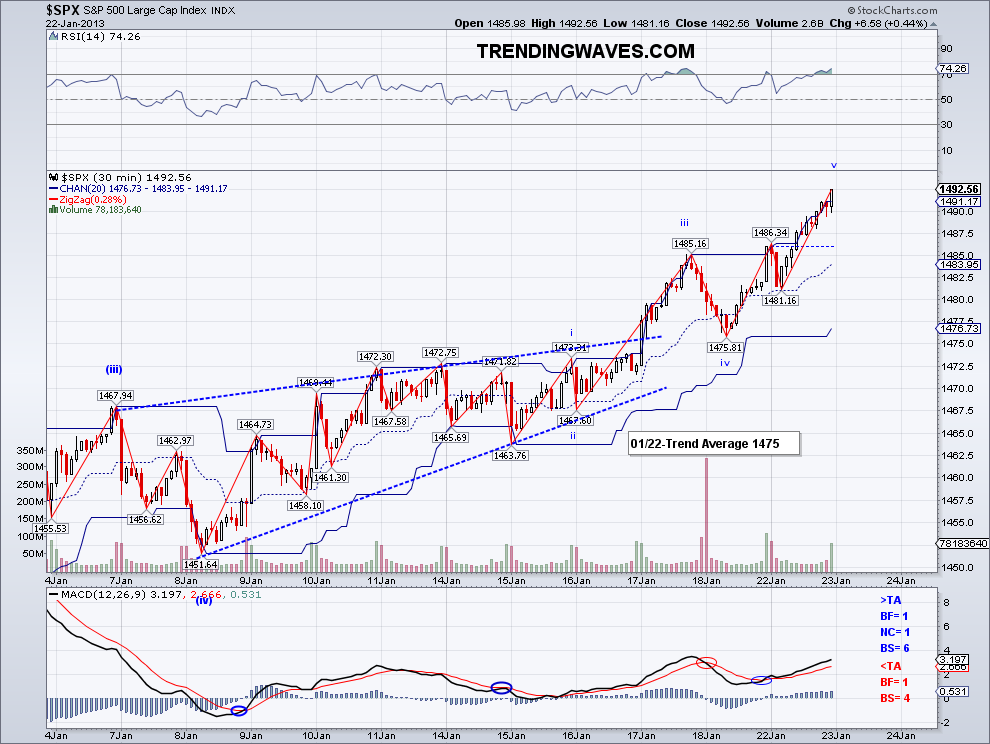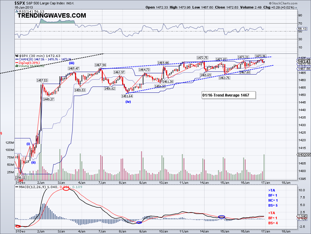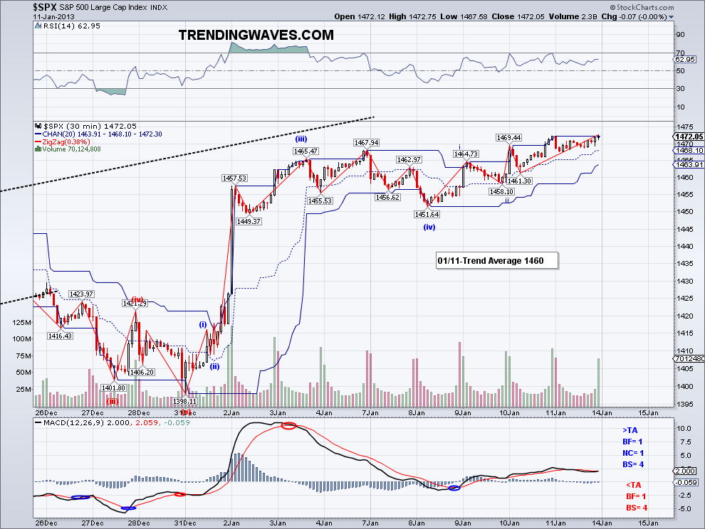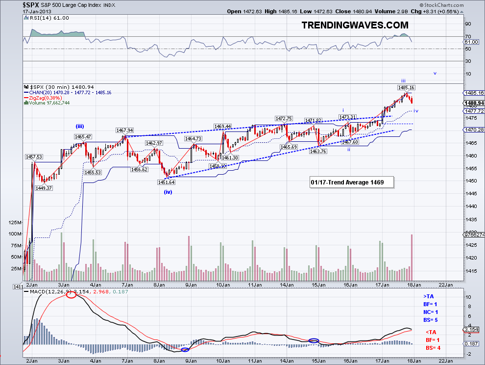 So the market closed the month up 5.2%, the best performance since 1997. And if you want to see what happened the rest of 1997, look at the second chart.. it went up 25% more. Obviously, it would be a fallacy.. a gambler's fallacy to be exact, to assume that past results affects future performance. But sometimes these past performances are worth a look as one can see how the market deals with momentum. Right now the market has a strong momentum and despite many opinions (mine included) that a top is close, the fact is the market has not traded or even really tested the Trend Average for a month. And until the market turns the TA bearish, there is top yet. February is usually a weaker month and realistically the market can't go up 5% every month. In fact, the best year the S&P500 has had in recent times is 1997 and that was a rise of 2.5% per month on average. So I won't be all that surprised when a correction does occur but for now the market has not breached key support, so we could be witnessing another sideways move before a bullish run. Perhaps the DOW needs to make an all time high to change all those Elliott Wave doomster counts before turning south?