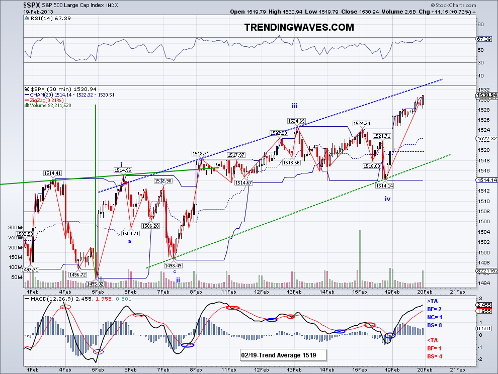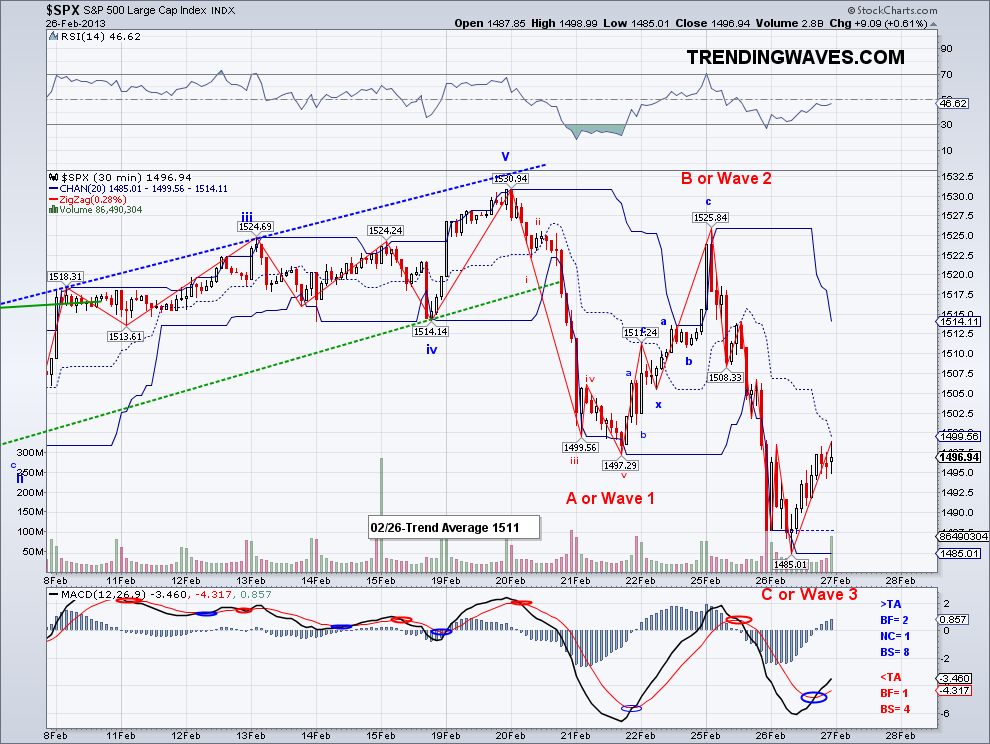 The market managed to add a few more points to the bullish wave from 1485 and the DOW came within a few points of its all time closing high but then all gains were reversed as expected. So tomorrow we should see the bears answer to the 40 point rally and I think it is now a monumental task to reverse all the bullishness in the markets but who knows? I am still watching the same level as yesterday so again, if 1498 holds and we get a quick bullish bounce, then the market will be headed towards 1550+. And btw I made a mistake yesterday (thanks TDD), the all time high is at 1576 not 1555. But I think a challenge to the all time high is highly likely on this coming wave or after the correction (if we still see more selling). Once there, it will be interesting to see if the market can break out of this range and go way higher. And yes, I know there are many bad news that the market seems to have completely ignored and as much as we rationalize it, it's just better to trade with the price trends.. again, the opinion vs fact battle. The short term trend average is now officially in neutral as we got 2 closings above the TA but the number is not trending up. So we should get an answer tomorrow or Monday.