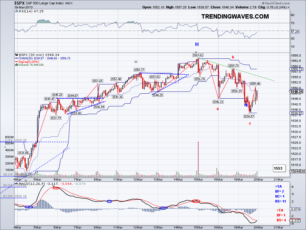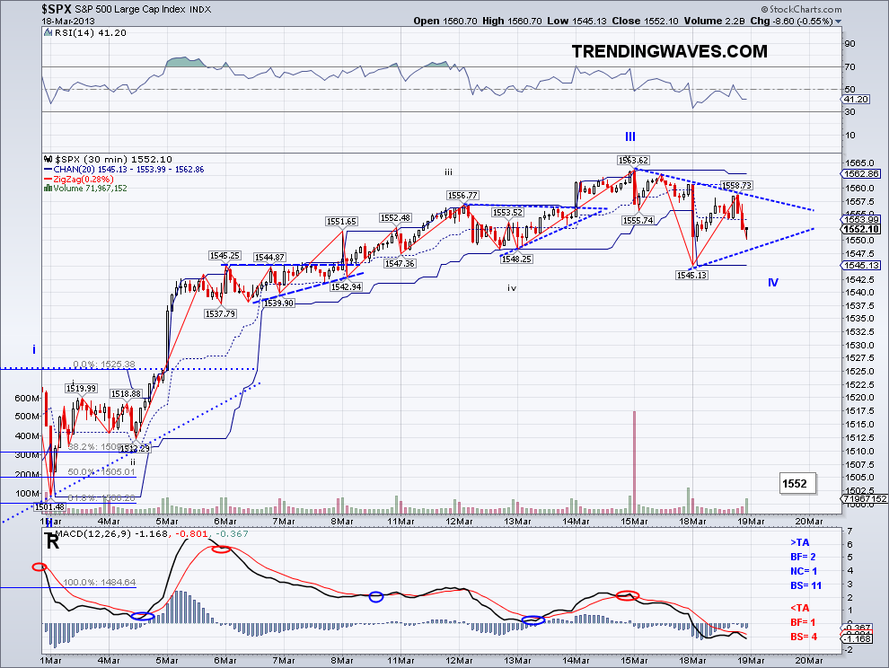 Today's rally confirms my speculation that Monday's high started the Int W5 leg. So with that out of the way, all we need to do is add 40 points to the Int W4 low of 1538 and voila! However, the W3 coming out of the range doesn't seem as strong as I had hoped. So unless there isn't a stronger follow through next week, the market might be putting in an Ending Diagonal or a Rising Wedge. Also, I was wrong in assuming there would be stronger short covering so we'll just have to see how the market reacts if 1576 gets taken out. I figured experienced traders (like Doug Kass among others) who have been short for the entire rally this year would have some sort of stop loss at some point and the logical stop would be this range. If we see a strong follow through that ends the current wave from 1551 at around 1580, then this Int W5 will likely reach the 1589 target I have been mentioning since last month and who knows, my 1600 target for 2013 might just be reached with some extra fuel. Whatever the case, this has been one of the best quarters in over a decade and the best thing about this was seeing how using the Trend Average navigated us through uncertainty and all those overbought oscillators (some with multi-year overbought readings). "Regular" technical analysis would have kept the average joe and apparently many professional traders out of the market or worst yet shorting for past 2 months or so. Lastly, I have been working on some calculations that go in tandem with the trend to project waves in early stages. That's why you've seen me project waves in advance more than usual lately as I am basically real time testing. So far, this has helped me improve my trading accuracy.